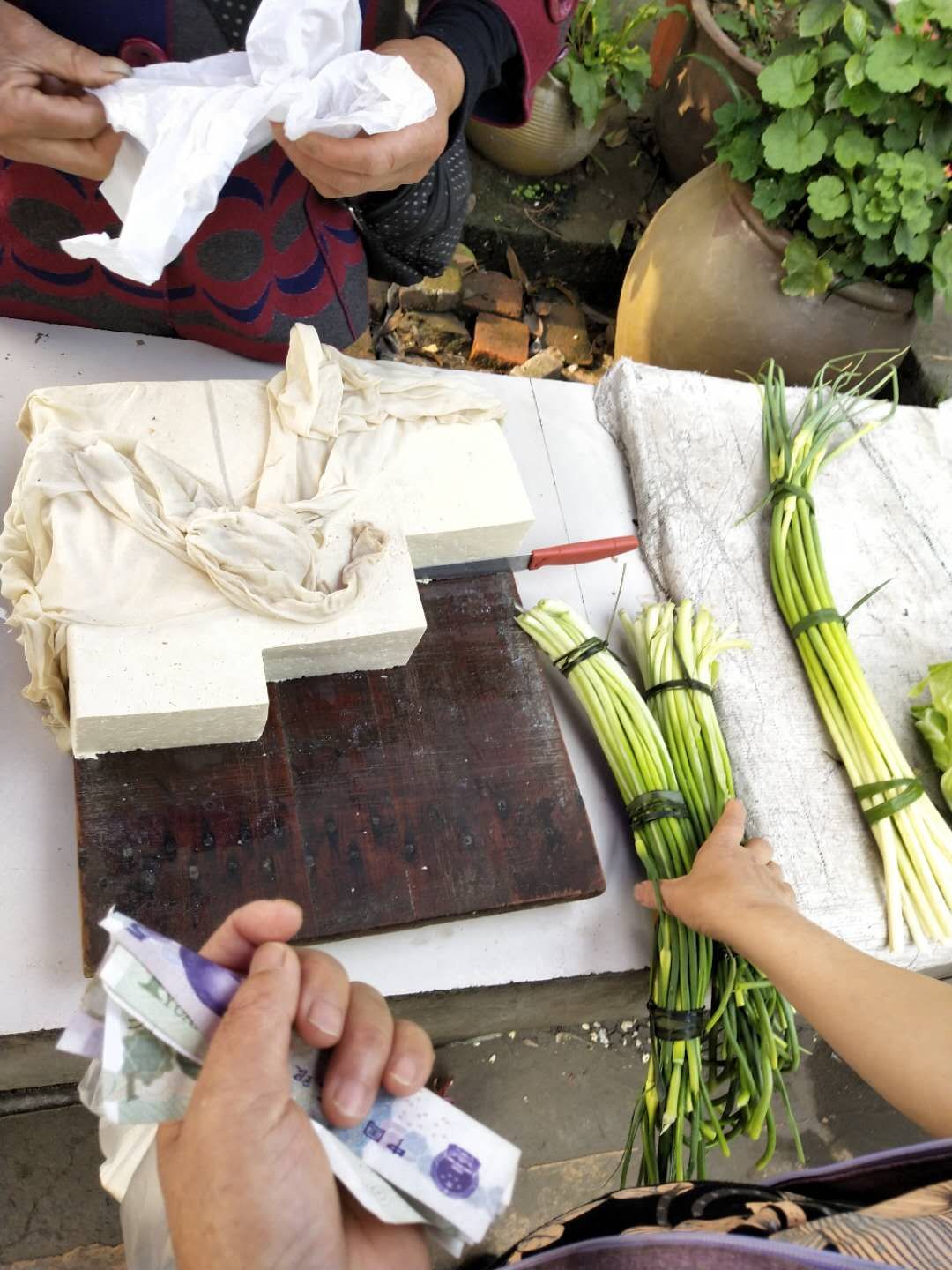 记得那次,我和爸爸选好豆腐,边放到他手里边问:“青师傅,多少钱?”青师傅摸着台秤,把豆腐放上去,说:“帮我按一下6。”我们选的这种纯酸水豆腐,别的地方卖三块五一斤,也就是七块钱一公斤,而他只收六块钱一公斤!“秤上是多少?”青师傅“望”着台秤问道。“四块四角八。”我如实回答。“好,四块钱!”我塞给他五元钞票一张。青师傅摸捏着,说“该找你一块,对吧?”我惊异于他辨认钞票的准确,连连回应“对!”“对!”