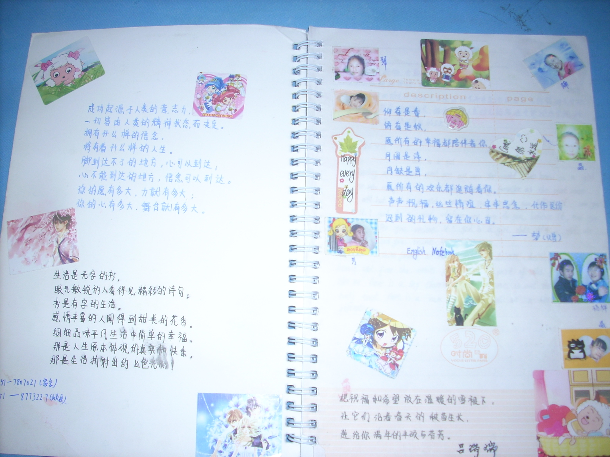 打开笔记本,扉页本来是白的,但经过我的装饰后就显得不那么单调了。上面贴了朋友的照片,每当我记笔记时,就会想到和他们在一起时美好的回忆,还贴有一些贴画。再加上一些字的衬托,就显得更加生动形象了。刚开始,我舍不得用他,但最后一想放着还是放着,不如我利用他,这样才会显示出他的价值。俗话说的好,人常用的东西都不值钱,但有真价值,没有用过的东西虽有价值却无异破纸。