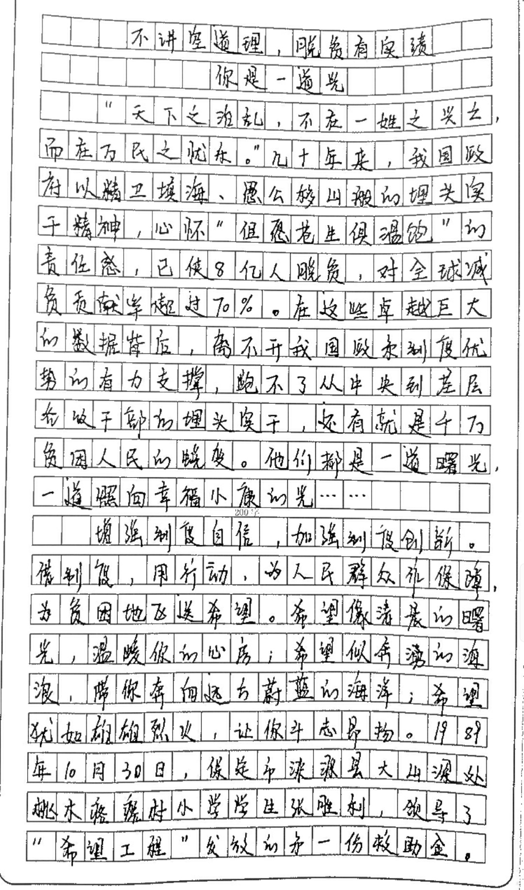 党和政府,立制度,干行动,为人民群众筑保障,为贫困地区送希望。希望像清晨的曙光,温暖你的心房;希望似奔涌的海浪,带你奔向远方蔚蓝的海洋;希望犹如熊熊烈火,让你斗志昂扬。1989年10月30日,保定市涞源县大山深处的桃木疙瘩村小学学生张胜利,领到了“希望工程”发放的第一份救助金。张胜利作为爹死娘走的事实孤儿,“希望工程”发放的200元救助金既是他唯一的生活保障,同样是用知识改变命运的希望。如今,每当谈到“希望工程”时,他口中频频出现的是“幸福”。由此可见,我国在扶贫工作中,党和国家下足了功夫,使足了劲儿,不断培育制度新优势,不断为人民立保障、送希望,不断为人民谋幸福。