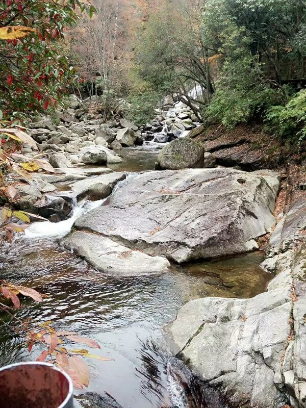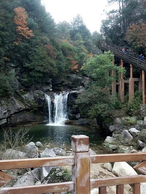 走出鸟语林我们来到一条长而陡峭的木栏坡道,从半山腰上透过树枝间的空隙向下望,一条小溪穿流其中,清澈纯净,时而飞瀑泻长,时而跃生水花。让人感受那种飞流直下的气势,十分壮观美丽,仿佛在欢迎我们的到来。