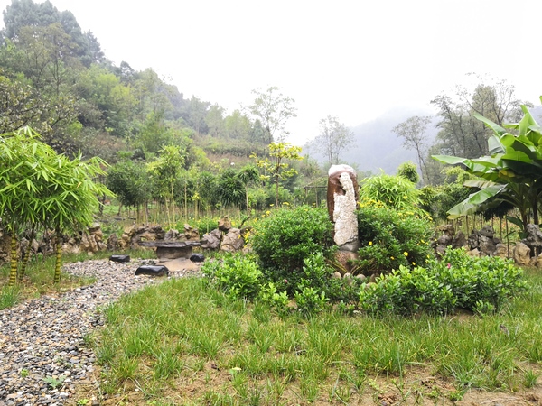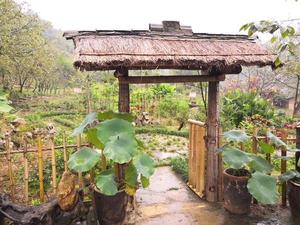 看,那就是花园的大门,原木的柱子,茅草的屋顶,土瓦的屋脊,看起来土里土气,却充满着乡土的气息。大门两边种着两缸荷花,像两个看门的士兵,士兵旁边,立着一根枯木,听妈妈说,这个枯木记载着她一路创业的故事。在这枯木的上方放着一块石头,这可不是一块一般的石头,石头上的图案就像梵高的星空一样让人充满无限的想象。打开竹门,我们来到了圆形的小广场,广场周围种满了麦冬草、栀子花和杜鹃花。