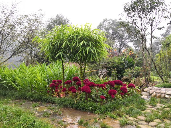 继续往回走,在一座石拱桥的左边,那是三棵郁郁葱葱的竹子,每一个竹节都胖胖的,像极了佛祖的肚子,我们叫他"佛肚竹"。佛肚竹下,我们又看到了火红的鸡冠花,再往左看,九月时节,白色的姜花陆续开放,微风一吹,那兰花的幽香让人沉醉其中。爸爸说,用这些花儿做成姜花茶,那滋味从年头会香到年尾。