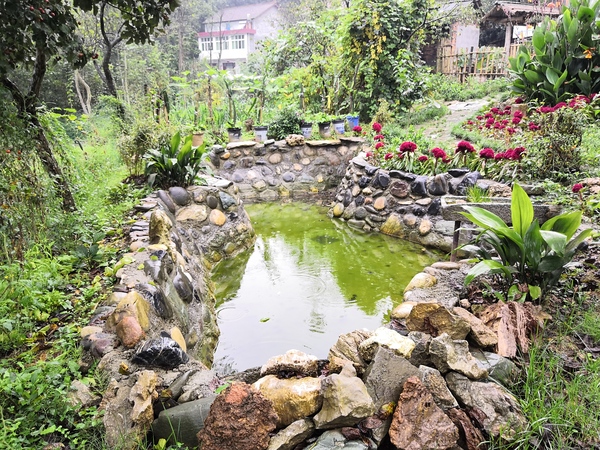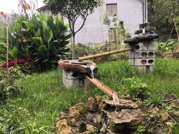 在池塘的左侧我们会看见一个石磨滴水,他是爸爸设计的,磨盘、石头、砖块、竹槽、流水,让这个美丽的小花园一下子有了它的灵魂。或许有人会好奇这水是从哪儿来的?哎!这是个秘密,你自己来看不就知道了。对了,忘了告诉你,这流水是为小蜜蜂采水而设计的,只有清洁的流水,小蜜蜂才能酿造出甘甜的蜂蜜。