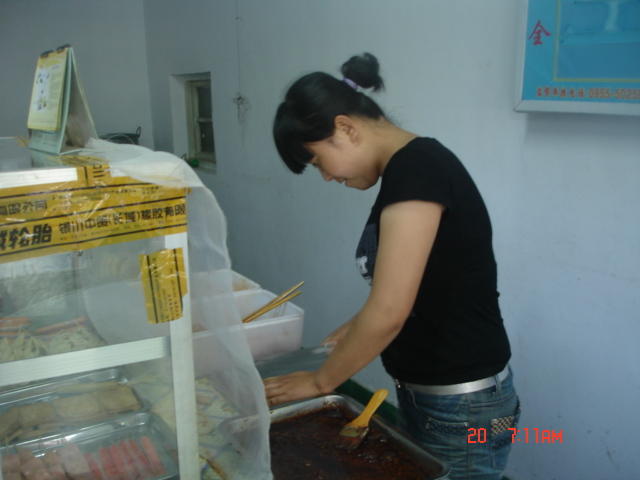 你看见了吗?这个阿姨就是这家店的主人,她今年26岁,在这经营着这个店,你别小看这个店,这里的顾客可不少啊。她有时顾不过来,便把我们几个回民女生叫去帮忙,让我们帮她拿饼子、给顾客端吃的,收钱等这些忙。她看到我们很勤快,经常会高兴地说,我们几个娃娃很懂事什么的。