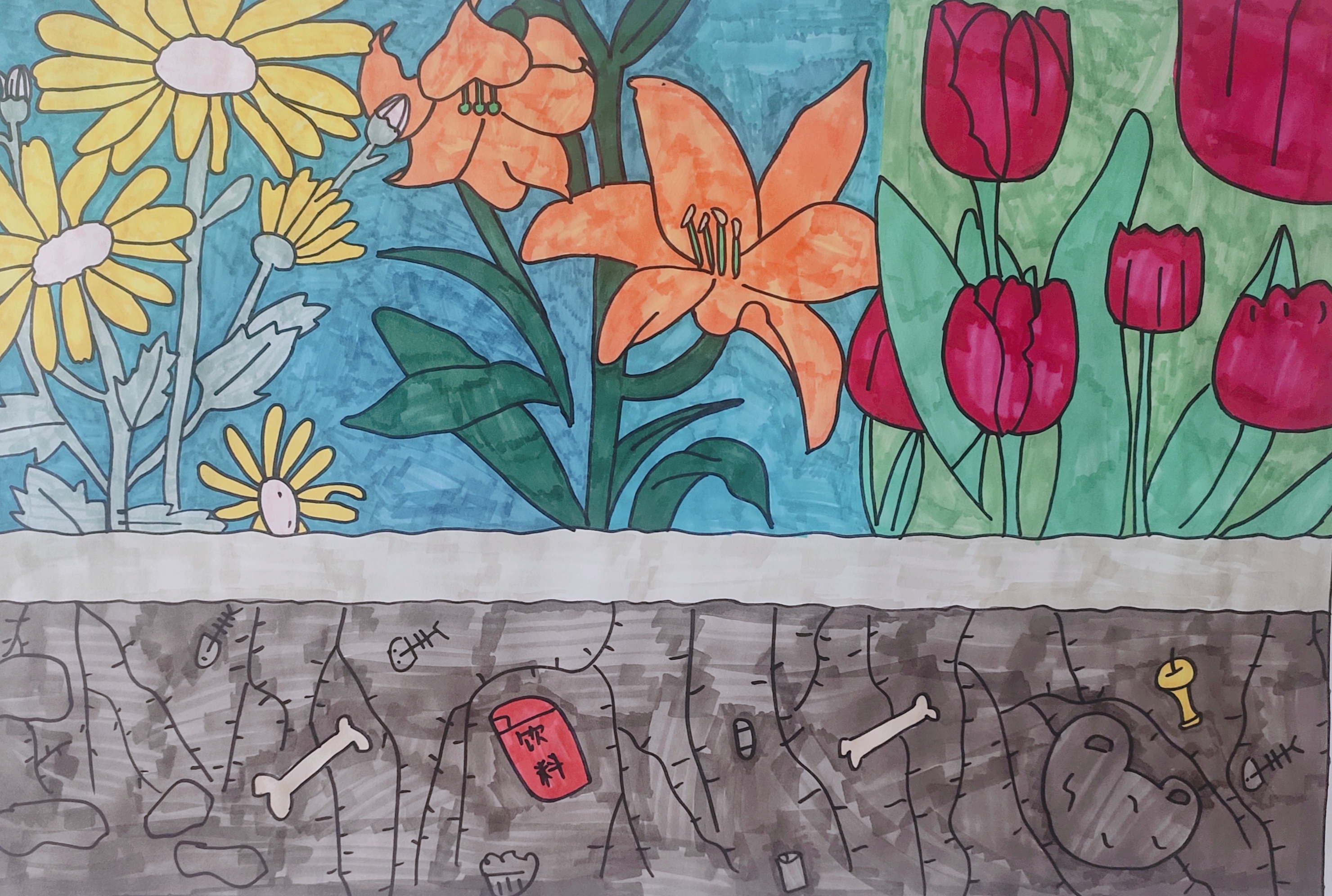 日常生活中,大部分人们都喜欢美好的事物。就像这画中的花朵一样,花朵开得越美丽,人们就更加喜欢花朵。但往往美好事物的背后总有一个不为人知的一面。花朵的地下根,根系发达,可周围却都是垃圾,影响了花朵的生长。现在的花朵开得这么美丽,时间一长,未必就美丽了。所以,借着这幅画,我呼吁人们要爱护生态环境,才能看到这么多大自然的美丽。