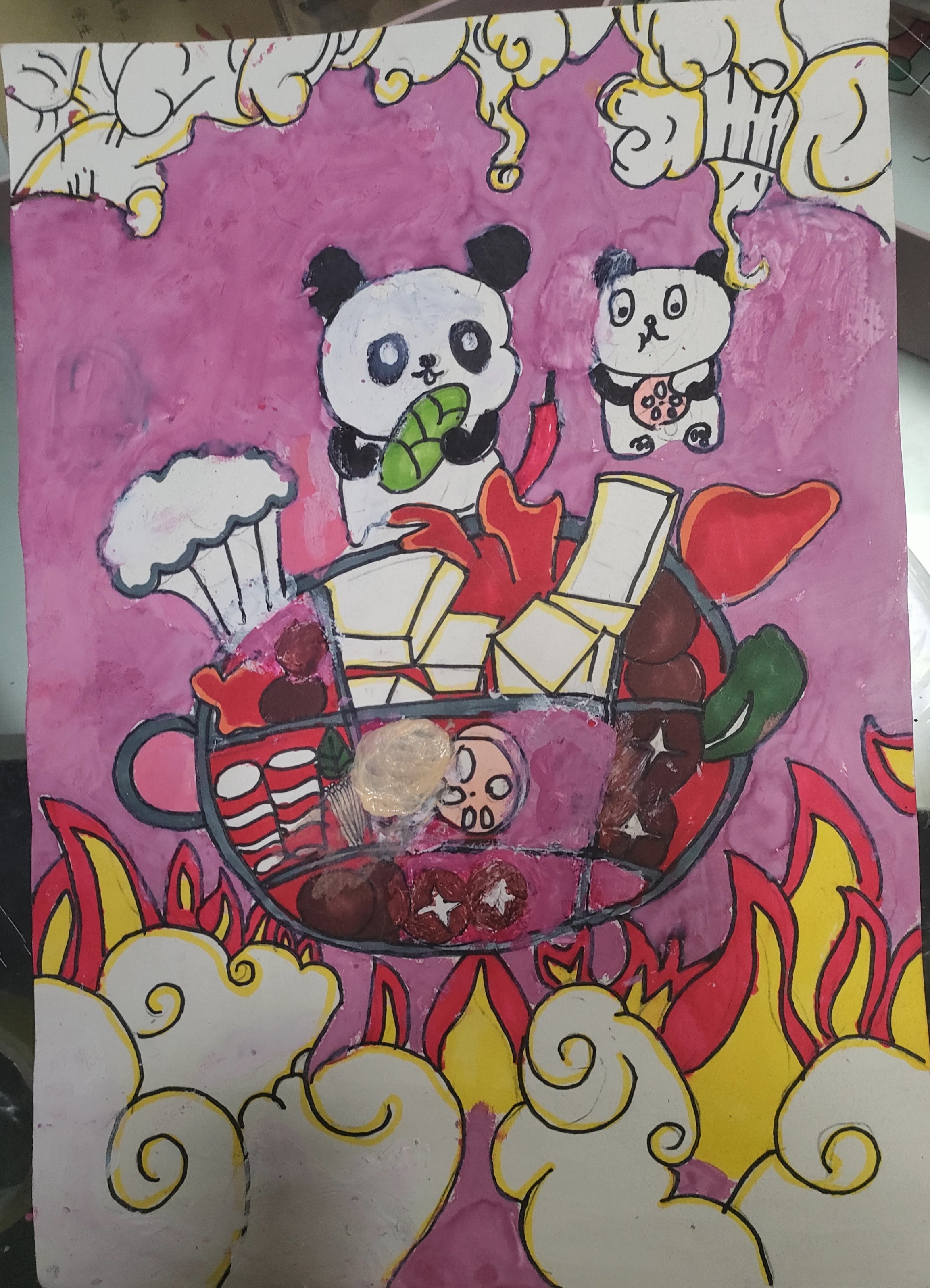 熊猫贵为国宝,大熊猫保护区主要位于四川省卧龙自然保护区;火锅也是四川特色饮食,被四川人民乃至全国人民所喜爱。 黑白的熊猫,红红的火锅,翻滚的祥云,层次丰富,色彩艳丽,都是代表我们四川的特色,希望大家都能到我们四川来看熊猫,吃火锅。