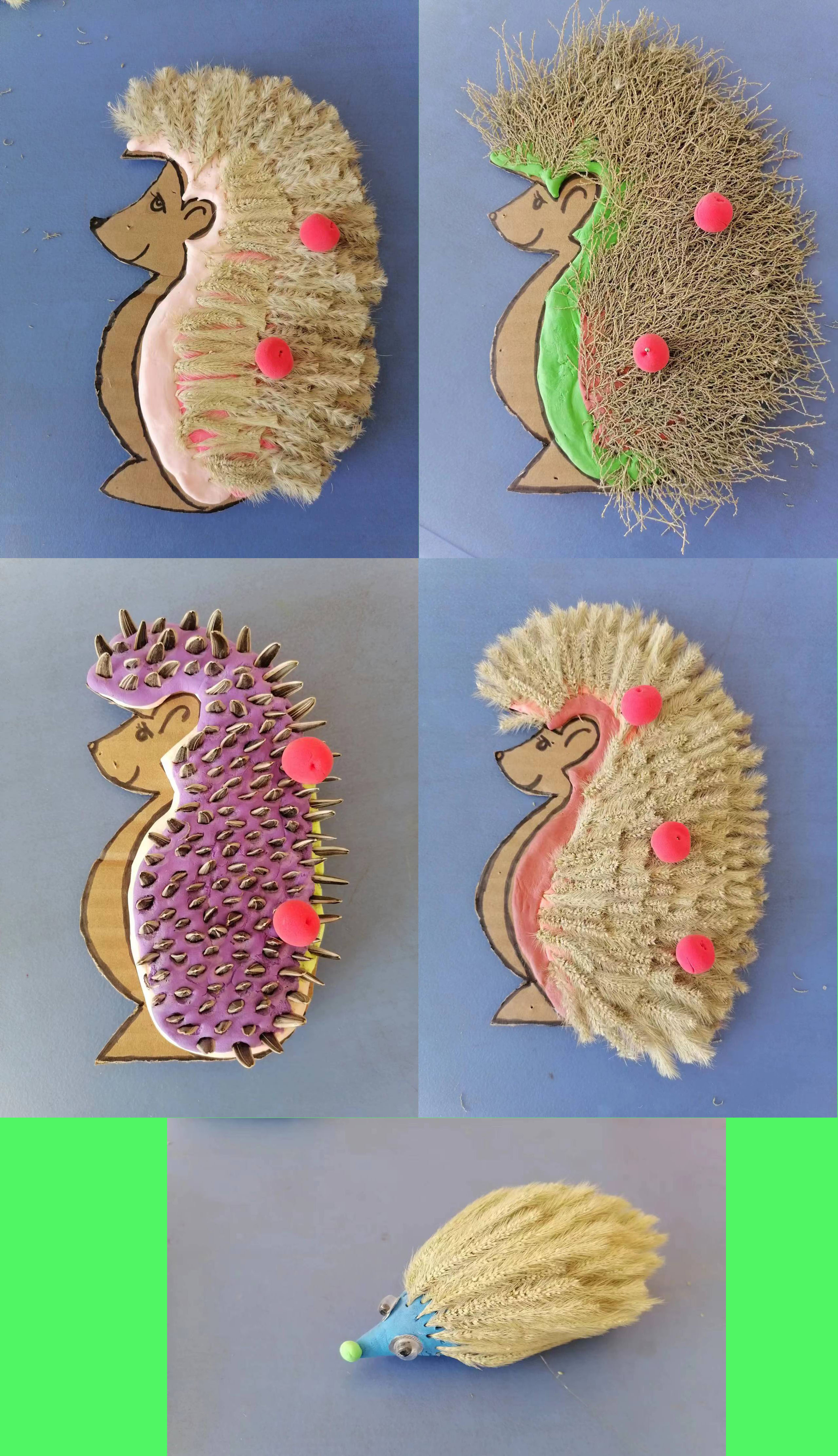 我利用我们身边常见的纸板板,画出刺猬兄弟的样子,然后再用橡皮泥给刺猬兄弟做好不同颜色的肉身,在到田野里去采集了一些狗尾巴草将这些狗尾巴草安装上去做出大哥名叫狗尾巴刺猬大哥,然后用葵花籽扮装出二哥,三哥和大哥一样只是肤色有点浅,四弟因为是用扁柏树枝装扮的看同去很肥胖,五弟因为刚出生不久,长的和其它兄弟不一样,可爱的刺猬兄弟一家五口,就这样诞生了。