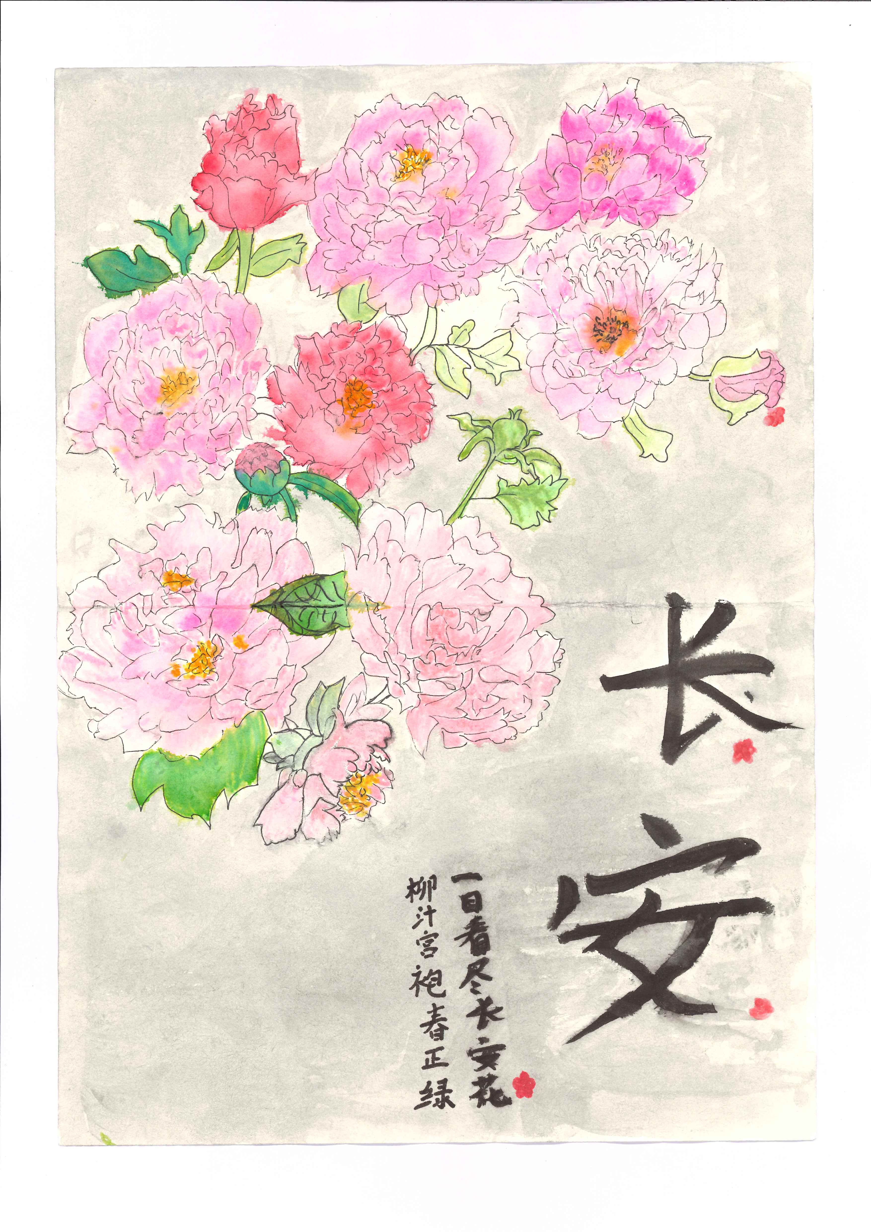 长安牡丹是一种特色植物,它象征着繁荣富贵,国泰安康。牡丹在当地因色彩多样,重瓣,有富贵之相而广受大众喜爱。它也因此成了我国的国花,人们多在家中种植牡丹,用来表现其富贵之意。我创作这副画,愿国家繁荣富强,国泰平安,如牡丹一样,欣欣向荣。