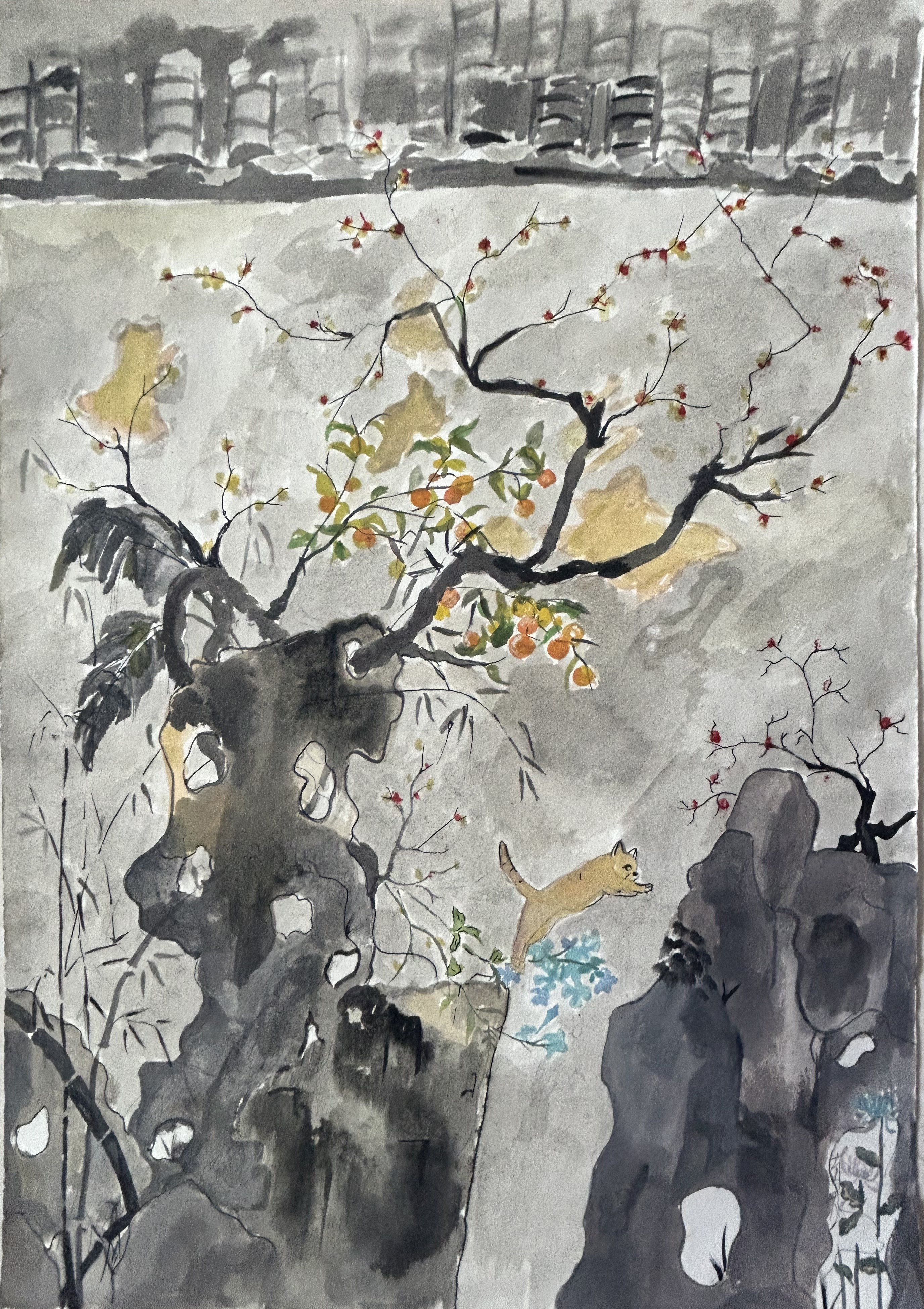 这幅画表现了作者对秋收景象的喜爱 ,对自然的向往。 画中的山峰、 柿子树 、海棠花 、小猫等构成了这幅秋收风景画 。通过浓烈的色彩和大胆的笔触, 将自然的力量和秋收的喜悦呈现的淋漓尽致 ,同时也传达了作者对自然和秋收的向往与喜爱 。整体氛围温暖而宁静, 给人以美好的视觉享受与情感共鸣,感受自然与人产生的感情 感受大自然的美好。