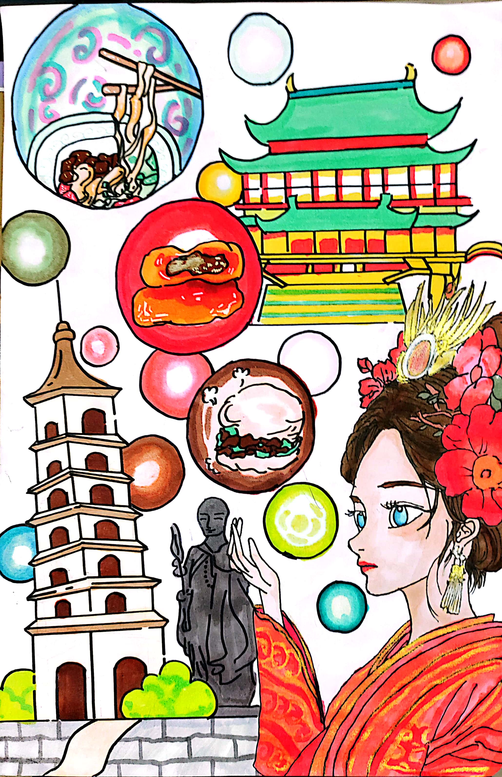 我画的这幅画名叫《吹出美丽陕西》。我画了肉夹馍、柿饼,biangbiang面 ,还有大雁塔与大唐芙容园,这都是我的家乡特色美食与美景。我画这副画是为了让更多人了解到我们陕西的特色,让所有人知道陕色是独一无二的。