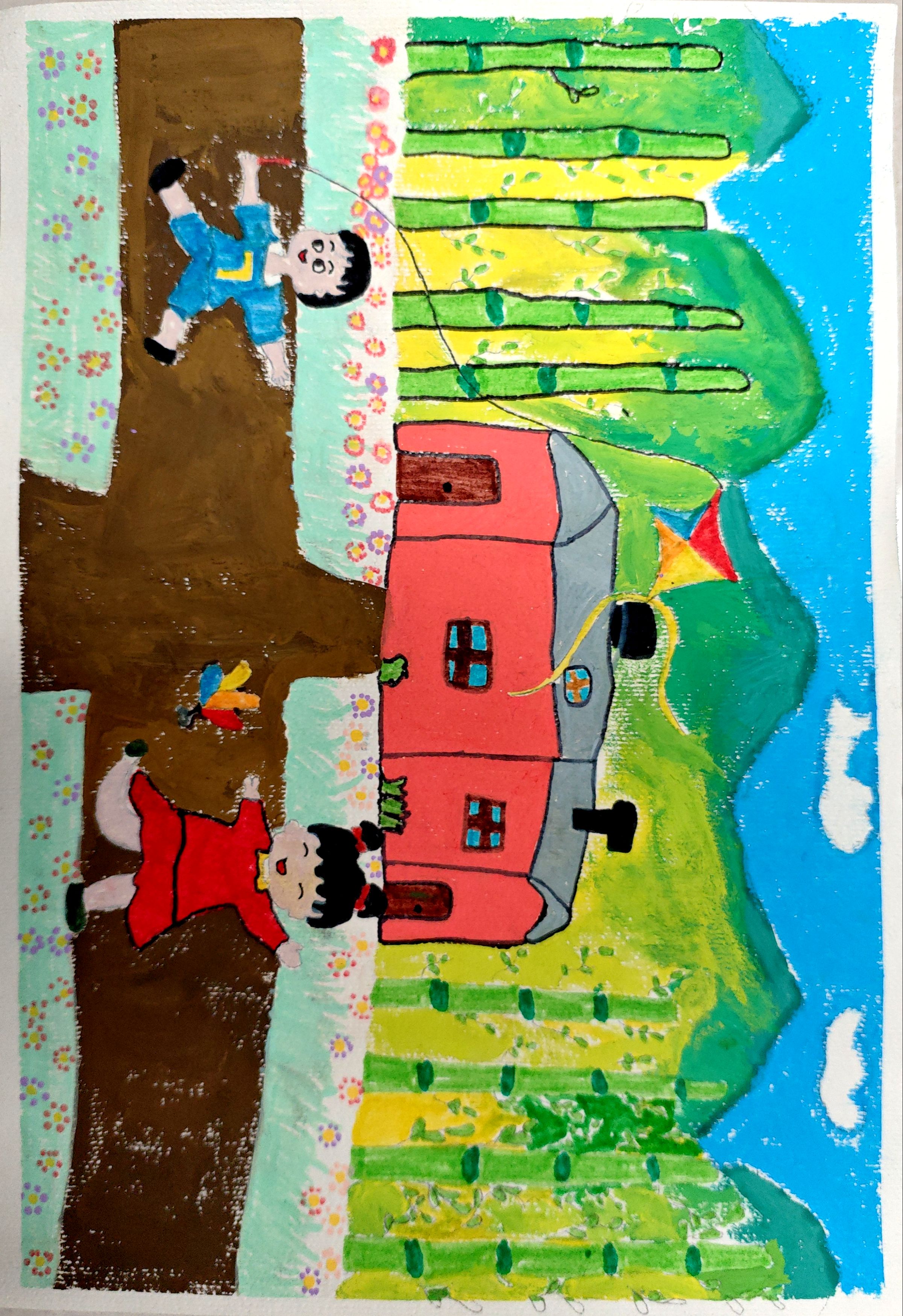 这幅画作以印象派的风格表现了阳光下的花朵和尽情玩耍的孩子,画中的色彩明亮鲜艳,给人一种温暖、美好的感觉。画家通过运用光线和色彩的变化,将自然的美景和情感表达得淋漓尽致,画作表现了作者对自然的敬畏和向往,画中的山峰、树木、 房屋等元素构成了一幅宏伟壮观的景象,给人一种壮丽、豪迈的感觉。小画家通过运用大胆的笔触和浓烈的色彩,将自然的力量和美妙呈现得淋漓尽致,同时也传达了自己对大自然的热爱和向往。让人感受到生命的美好和希望的力量。