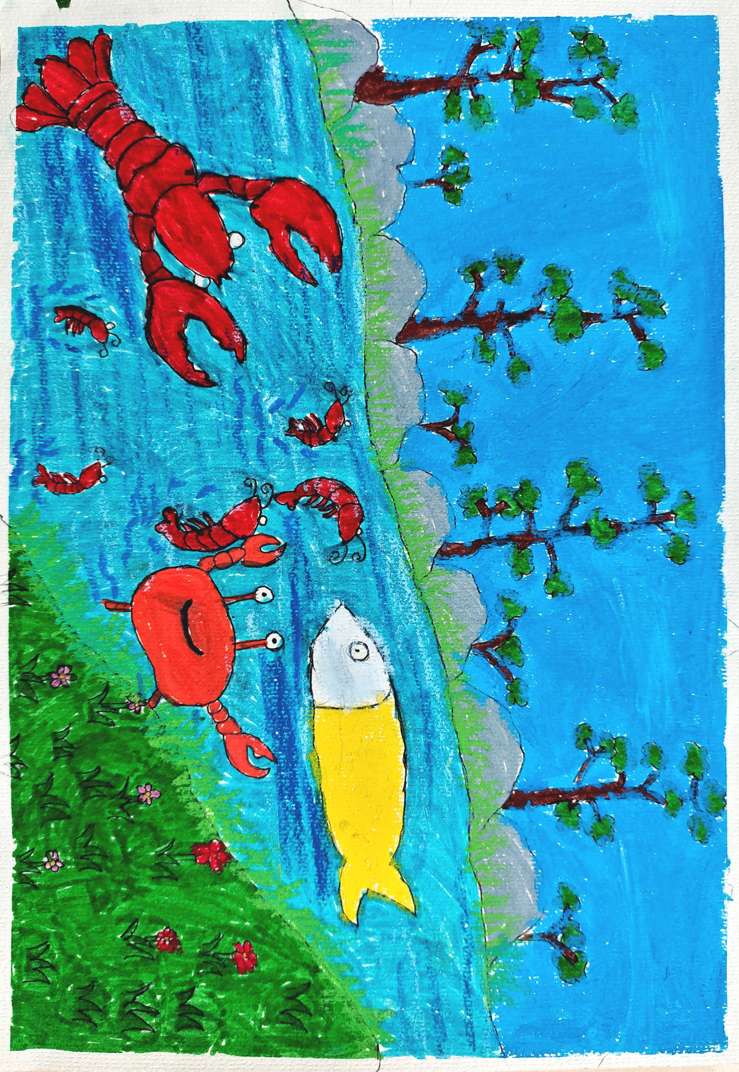 众所周知,虾兵蟹将是一个成语,指古代神话传说及神怪小说里海龙王手下的兵将。看似平静的河流之下,早已是虾兵蟹将与怪鱼的必争之地。这条怪鱼怒目圆睁,无鳞无鳍,看起来不太好惹,几只大小不一的虾兵张牙舞爪,或扑或跳,想着给怪鱼一个下马威,唯一的一只蟹将面露微笑,仿佛胜券在握。也不知这场争斗,到底是谁赢谁输?