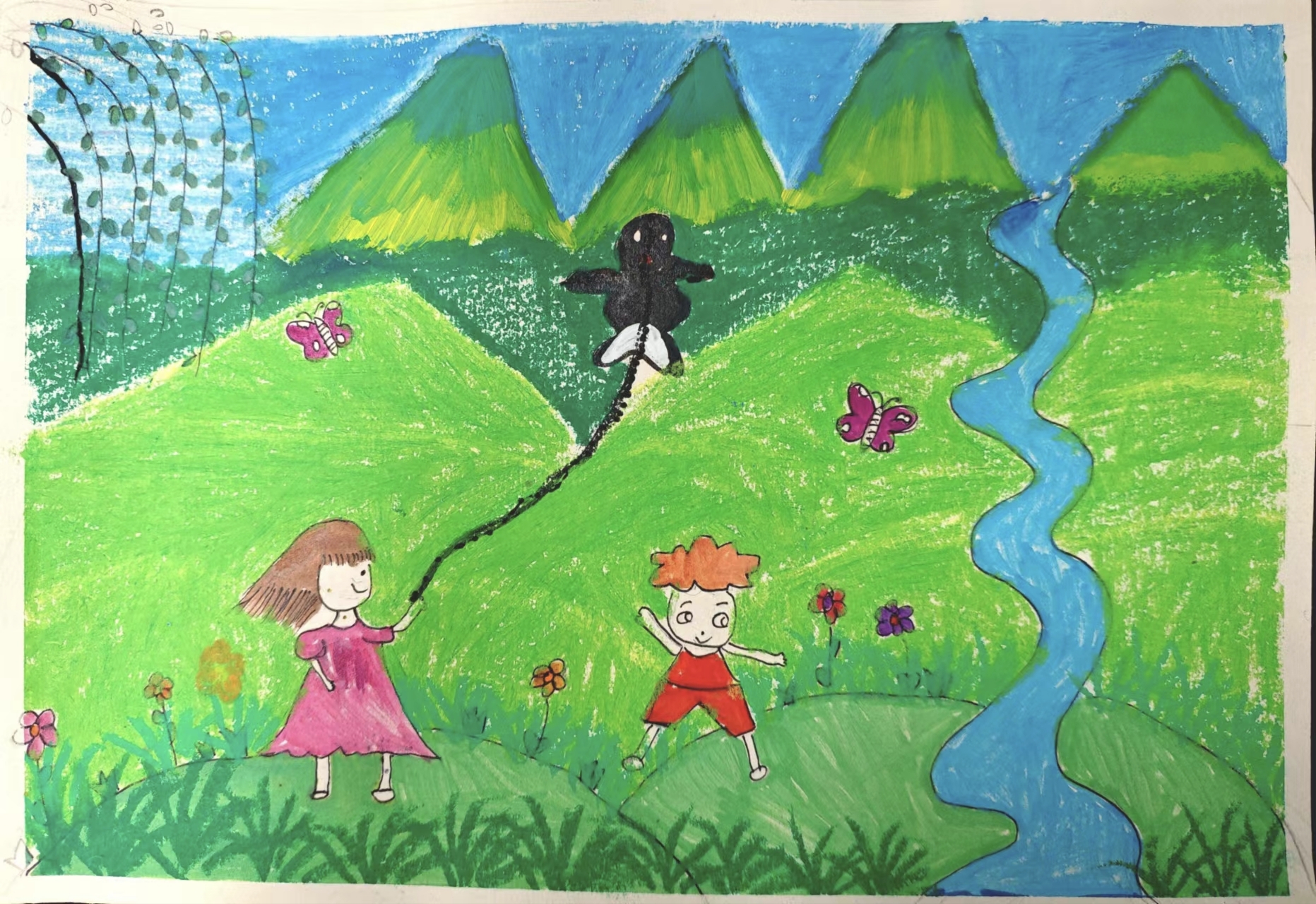"儿童散学归来早,忙趁东风放纸鸢",我的家乡是一个山清水秀,鸟语花香的地方,在二三月的春日里,放风筝是田野里经常看见的场景,今天我和班里的同学一起放风筝。以前老师手工课会教我们做风筝,我们用竹条和防水布以及颜料画笔,制作出一直燕子风筝,我们在广阔的田野奔跑,微风徐徐,让我俩的风筝越飞越高,非常的开心,我喜欢春天放风筝。