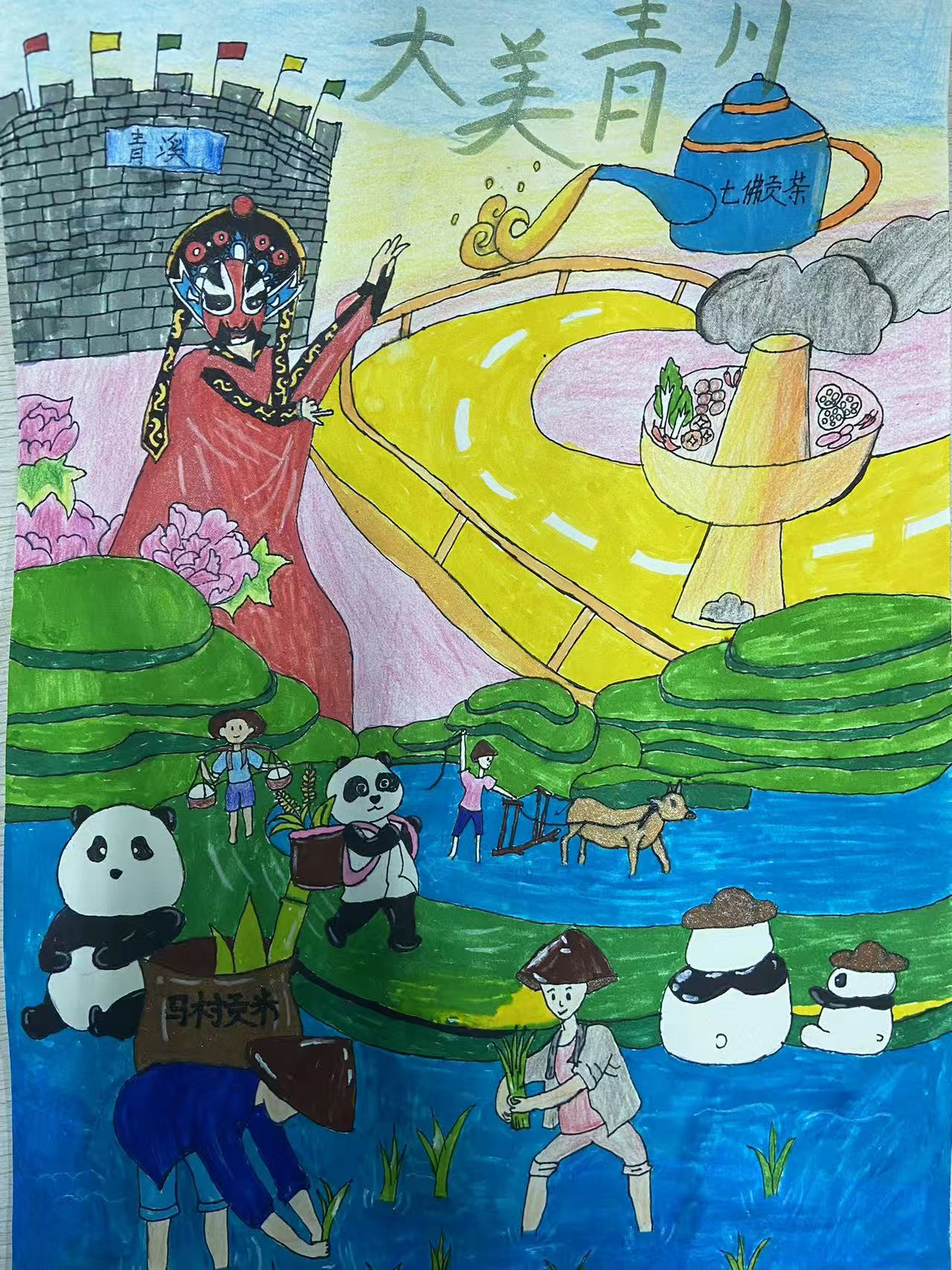 这幅画是对广元市青川县特色的精彩呈现。画面中,“七佛贡茶”以巨型茶壶的形象倾泻茶香,“马村贡米”伴随熊猫与农耕场景展现农耕底蕴,“青溪”古镇的城楼与戏曲人物彰显历史人文,青川铜火锅升腾的烟火气则传递出饮食文化的独特魅力,多元素融合,绘就了“大美青川”的多彩画卷,尽显其在物产、人文、饮食等方面的深厚底蕴与独特风情。