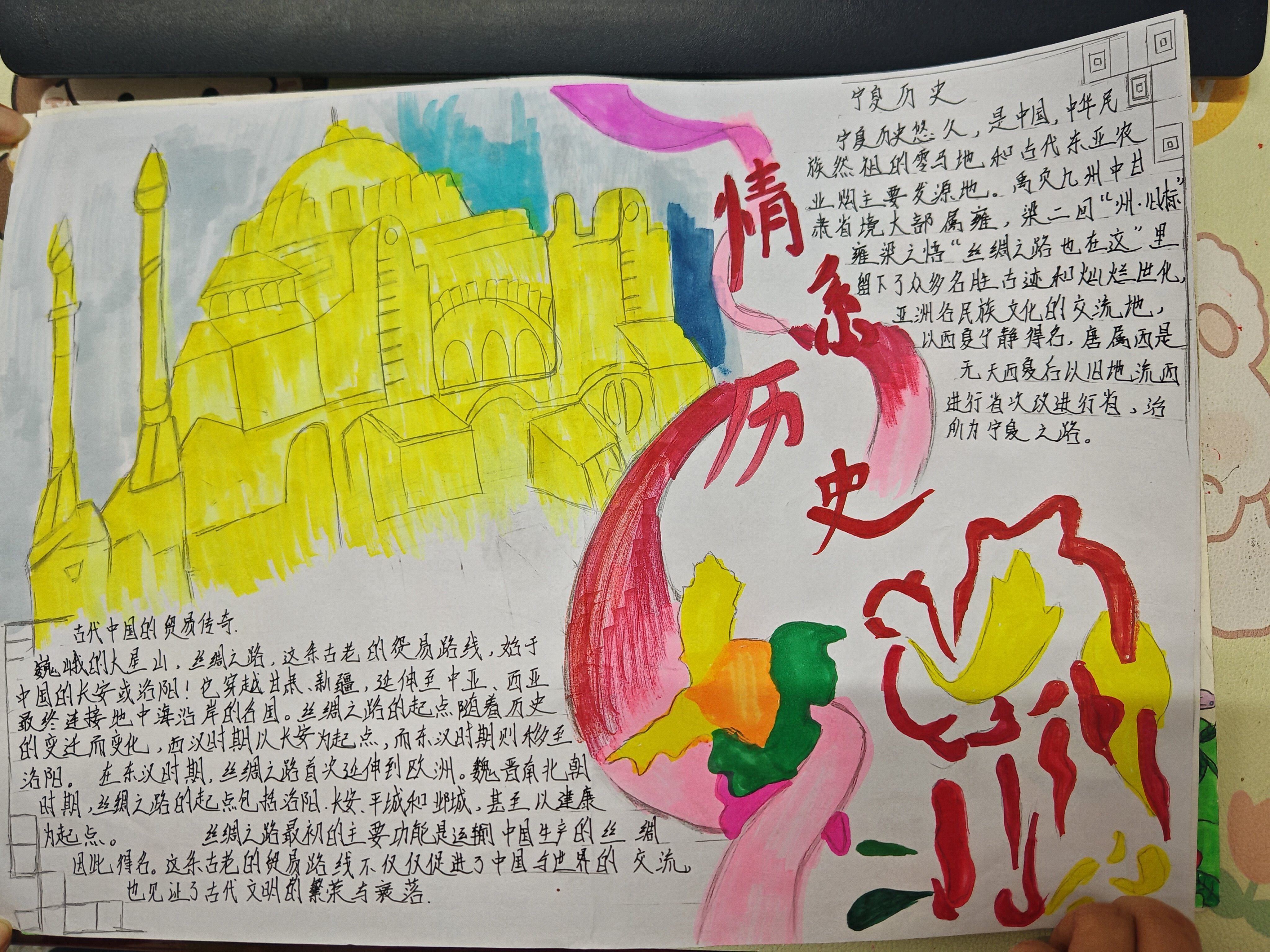 我们生在宁夏,宁夏有许多特色,宁夏是一个美丽的地方,我的这幅作品主要介绍了宁夏特有历史,绘画了一幅我们的回族象征的清真寺。清真寺建筑的高大,纯洁,还有宁夏的历史博物馆中有着丝绸之路的图册,丝绸之路像一只骆驼赶出了一条丝绸之路。宁夏是一个自治区,虽然宁夏在地图上它只是那么的渺小,但在这里我们建设了自己的家园,我们生在宁夏,我们是宁夏的儿女。宁夏还有很多值得去观赏的地方,有很多美食值得去品尝,宁夏是一个美好的地方,期待你来观赏。