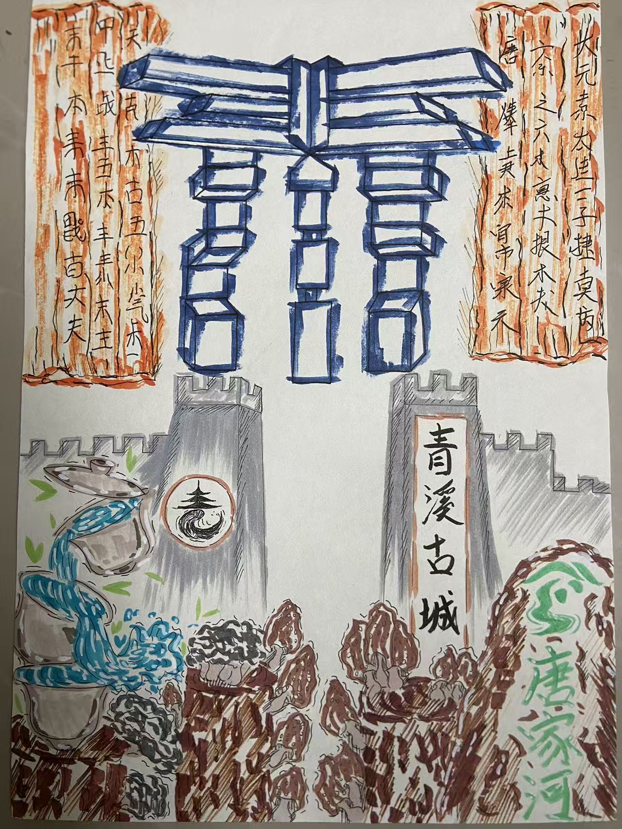 聚焦青溪古城的历史底蕴,通过对古城建筑(城墙、门楼)的具象描绘,展现其作为历史见证者的厚重感, 植入古文字简牍元素(左右两侧的文字设计),溯源巴蜀文脉,呼应古城在历史长河中承载的人文记忆,搭建起古今文字与文化传承的桥梁,融入"唐家河"自然符号与流水、陶罐意象,体现古城与自然生态的共生关系,凸显其"人文与自然交融"的地域特质, 整体以手绘的艺术语言,将建筑、文字、自然景观有机整合,意在唤醒大众对青溪古城历史价值、文化价值与生态价值的多维认知,传递对在地文化遗产的珍视与对历史文脉延续的思考。