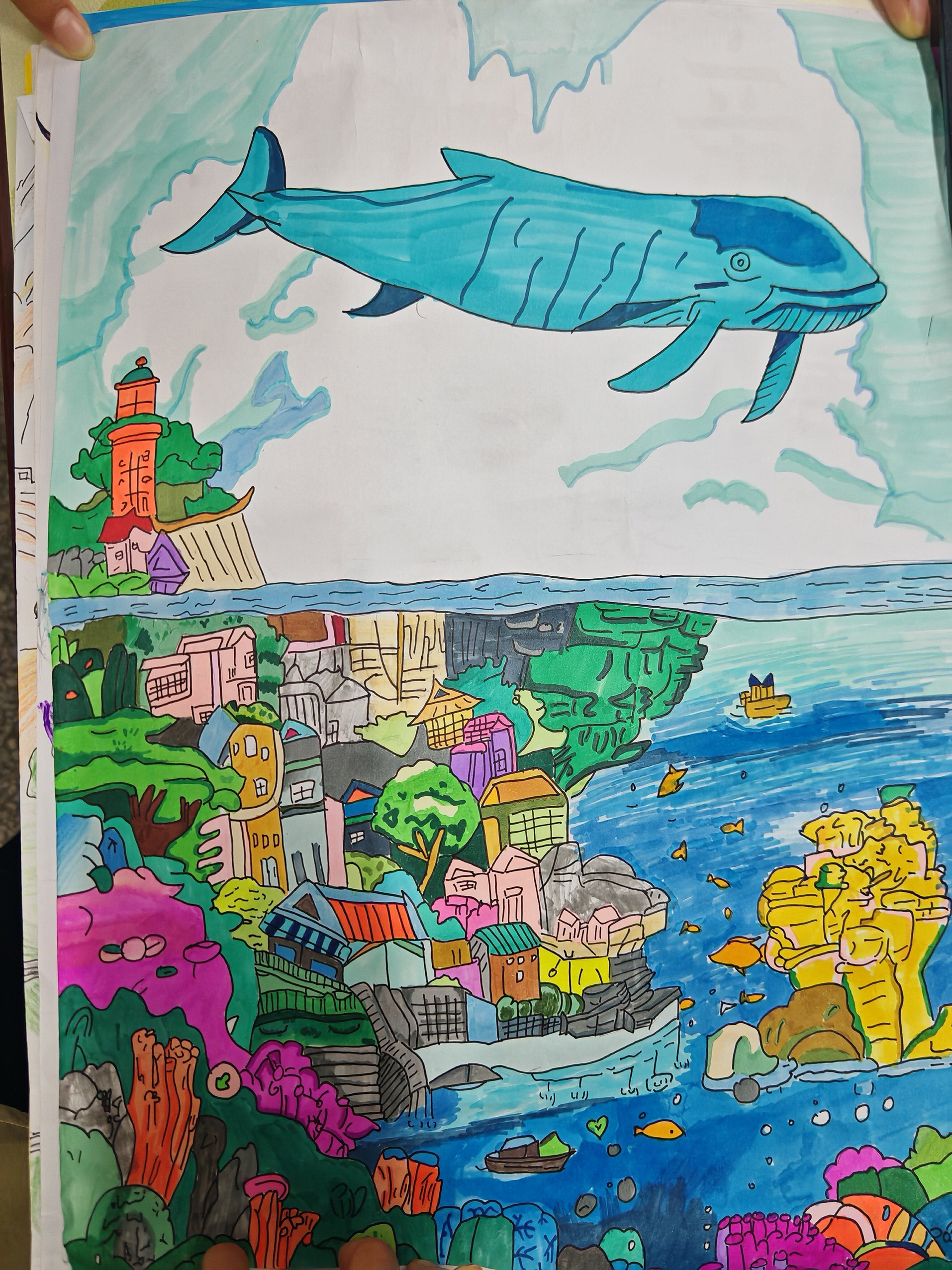 生态保育是社会上常见的,但人们却不以为意。我画这件作品的主要含义是多注意环境的卫生,保护生态的生长。 画中的多部分颜色选于蓝色,因为蓝色在我的理解里是清澈干净的。 画中有两部分内容,第一部分是海洋和珊瑚,他们代表了海洋动物需要干净的海洋,同样我们更是需要,所以我们与海洋动物是一体的。第二部分是鲸鱼,鲸鱼代表了所以海洋生物,所以我的这幅画主要表达了我对生态保育的真心,同时将环境保护起来。