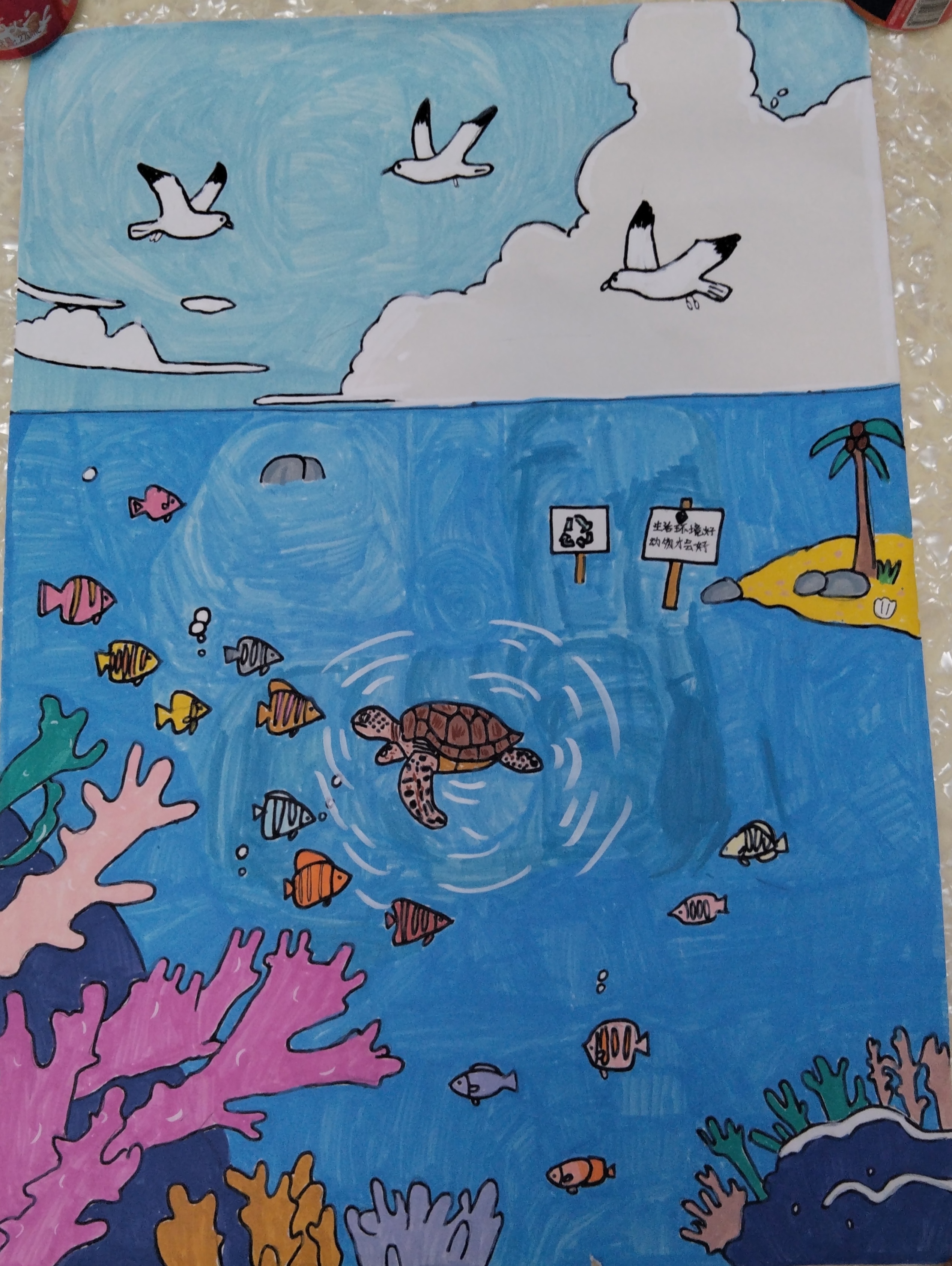 这部作品以海洋生态为主题,通过湛蓝海水、多彩鱼群,海龟及飞翔的海鸥展现海洋生机,岸边"生活环境好,动物才会好"标语与回收标志相呼应,传递保护海洋生态的理念,呼吁人们践行环保守护这片蔚蓝家园,让海洋生物自由栖息,人与自然和谐共生