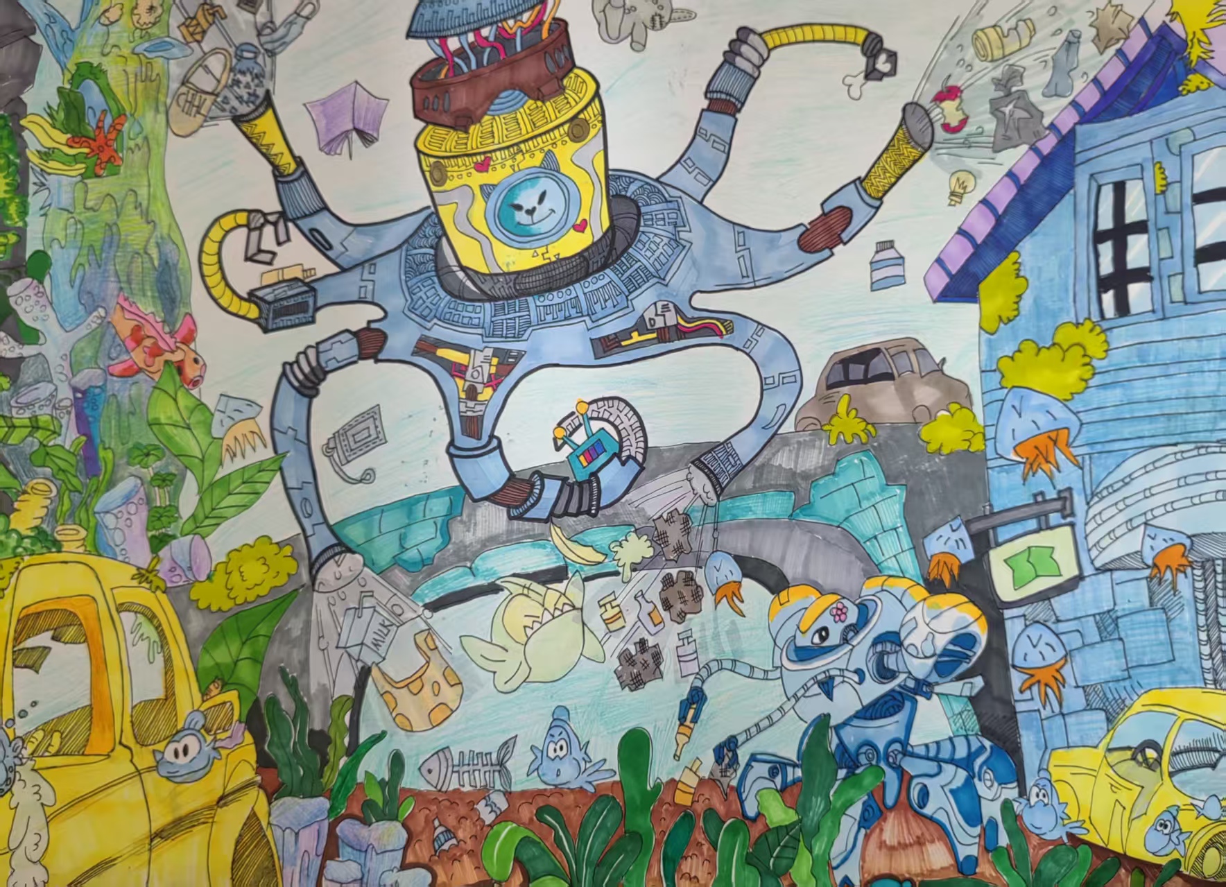 我用鲜艳的颜色画机器人,让它们看起来充满力量;把海洋里的垃圾和小鱼画得清清楚楚,就是想让大家看到污染多可怕。