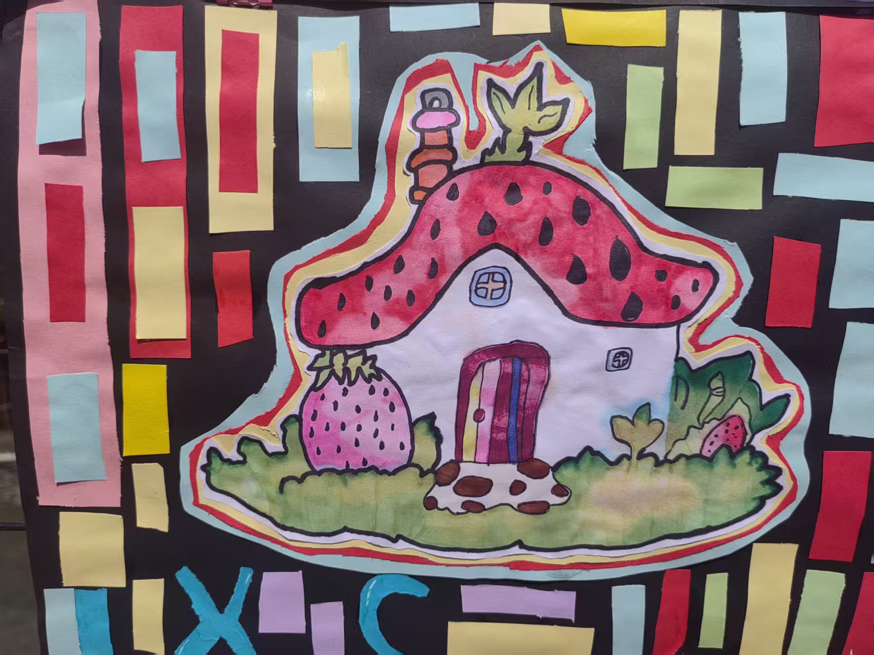 我这幅《莓果小屋》,核心就是想站在小朋友的角度,画出一个充满"自然魔法"的世界!我们都爱幻想,也超喜欢鲜艳的颜色,所以就把甜甜的草莓变成了小屋,用红红的、粉粉的颜色做主调,这样一看就很有童话里的感觉。 背景那些彩色的小方块,都是我用没用的彩纸剪下来拼上去的,让旧东西也能变好看;画画的颜料我选的是可水洗的环保款,就是想告诉大家,画画和爱护环境其实可以一起做到。 屋顶上的小籽、圆圆的草莓果实这些,都是我觉得"大自然里的东西都能变成家"的小小心思;而用这些环保材料来做,也是希望在学画画的时候,能悄悄记住要珍惜东西、把废品变成好玩的创意。