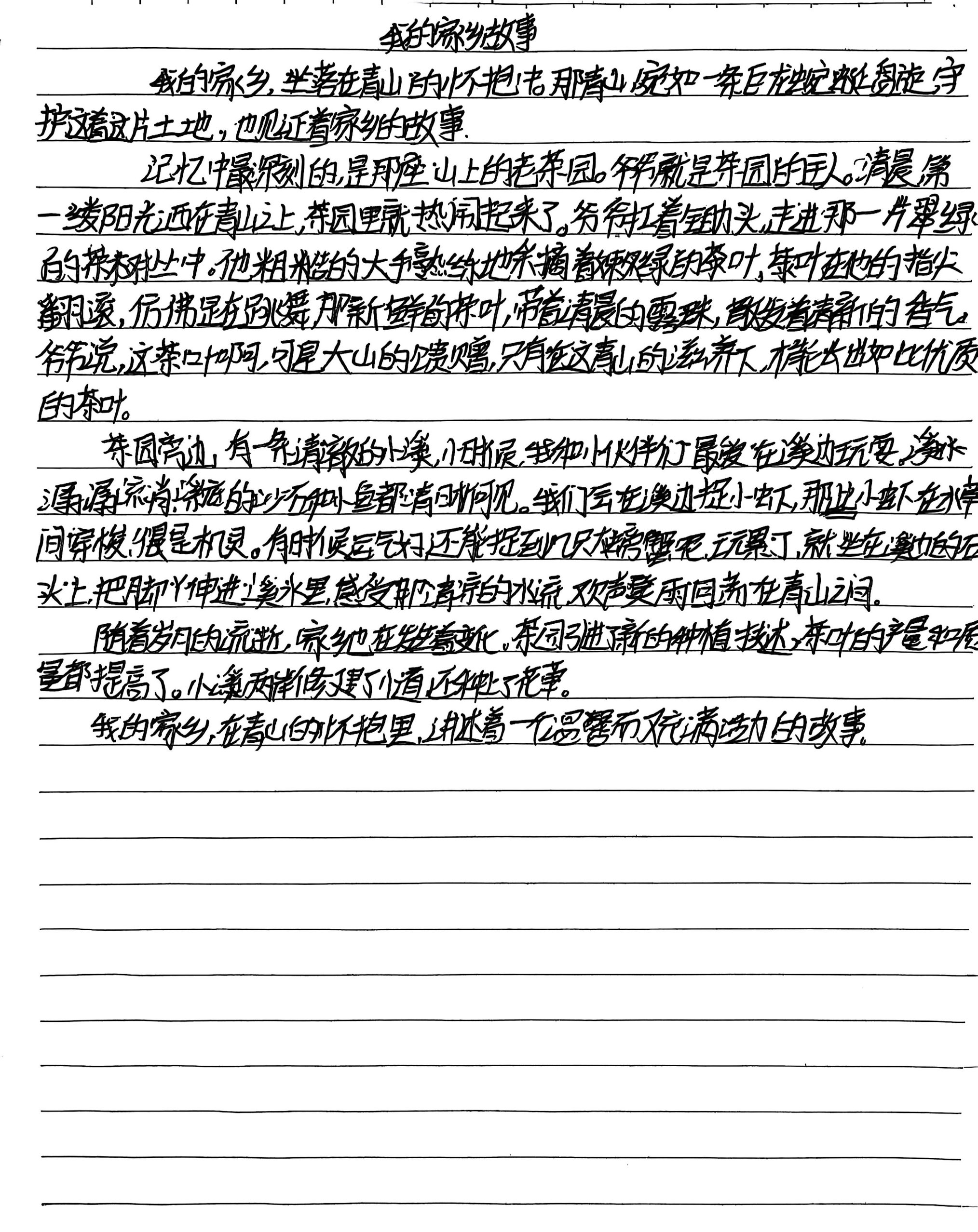 我写《我的家乡故事》,是想以青山为底色,定格故乡的温软与生长:爷爷指尖翻涌的茶芽、溪涧里蹦跳的鱼虾,这些带着晨露与欢声的日常,是故乡最鲜活的肌理。我既想留存老茶园里“大山馈赠”的朴素诗意,也想记录家乡引入新种植技术、溪流旁添步道的新貌——故乡的故事从不是静止的,它在青山的怀抱里,藏着旧时光的暖,也生长着新的生机。我愿以文字,把这份“温厚又蓬勃”的故乡模样妥帖记下。