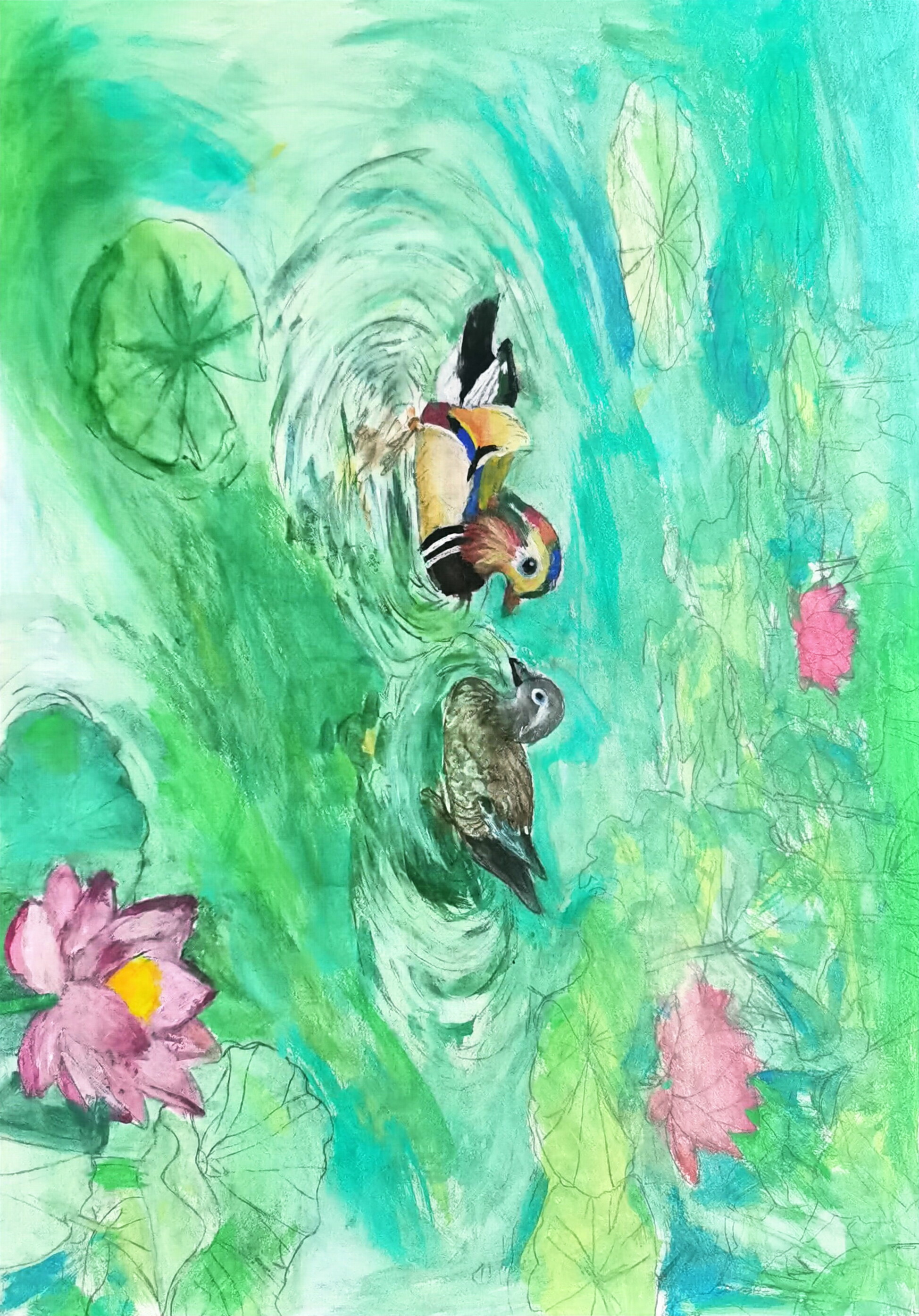 大家好!我画的是《鸳鸯村的荷塘鸳鸯乐》。我们鸳鸯村的荷塘可美啦,夏天荷花盛开,鸳鸯在水里游来游去,特别好看。这些鸳鸯是我们村的特色,好多人都来看它们呢。来我们鸳鸯村旅游,能在荷塘边看鸳鸯、赏荷花,就像走进了童话世界。希望大家来鸳鸯村,看看这些可爱的鸳鸯,逛逛美丽的荷塘,感受我们村的特色风光,玩得开开心心!