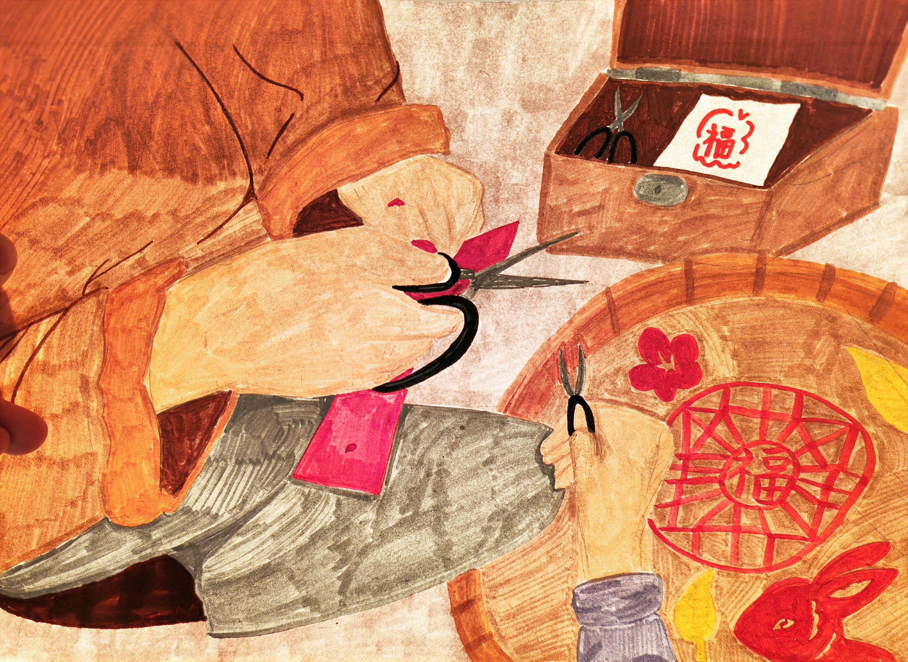 西部地区的剪纸文化,承载着深远的历史与丰富的文化记忆。它不仅是一门手艺,更是无数劳动人民智慧的结晶,是他们心中对美好生活的朴素表达与真挚寄托。我想通过这幅画讲述来自西部乡村最温暖的非遗故事——让剪纸文化不再是冰冷的技艺、博物馆中的标本,而是长辈与晚辈之间指尖上传递的温度,是一张张红纸背后对幸福生活的期盼与祝愿。 希望这个关于西部剪纸传承的故事,能让更多人感受到民间艺术生生不息的活力,也让我自己对家乡的文化,多一份自豪,多一份守护的责任。