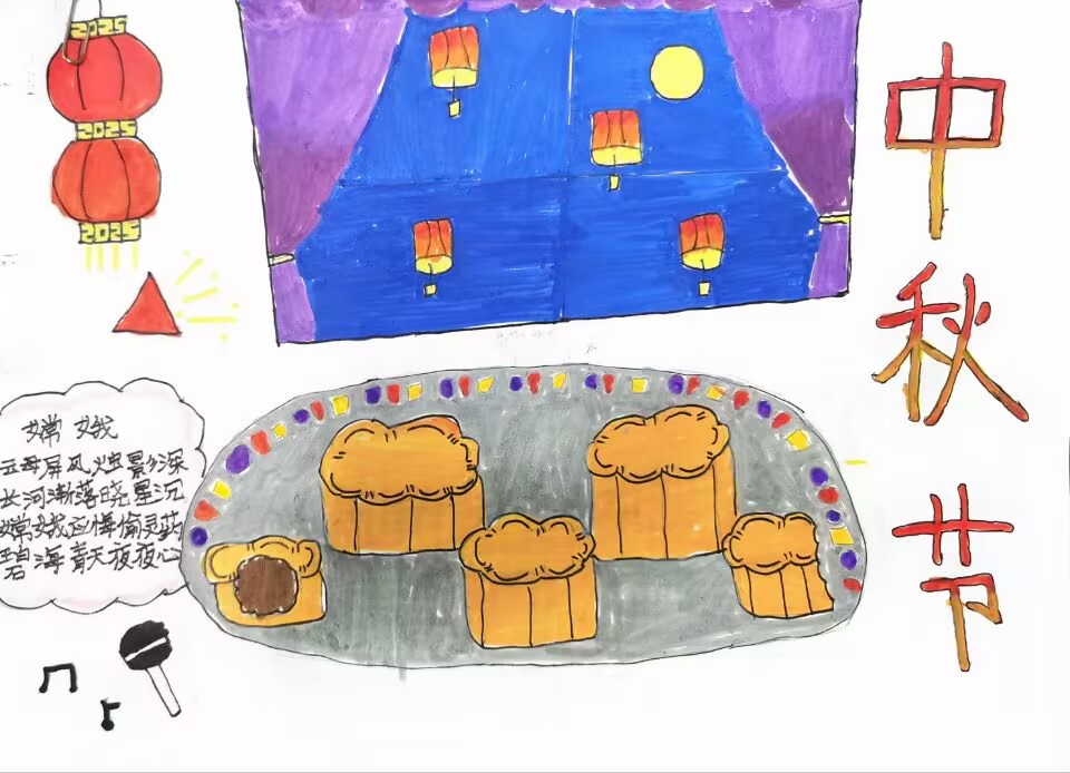 大家好!我画的是《中秋团圆月饼乐》。中秋节到啦,有圆圆的月亮,红红的灯笼,还有香香的月饼。吃着月饼,赏着月,多开心呀!还有关于嫦娥的诗呢,中秋节就是要一家人团团圆圆,吃月饼,看月亮,你们是不是也超喜欢过中秋节呢!
