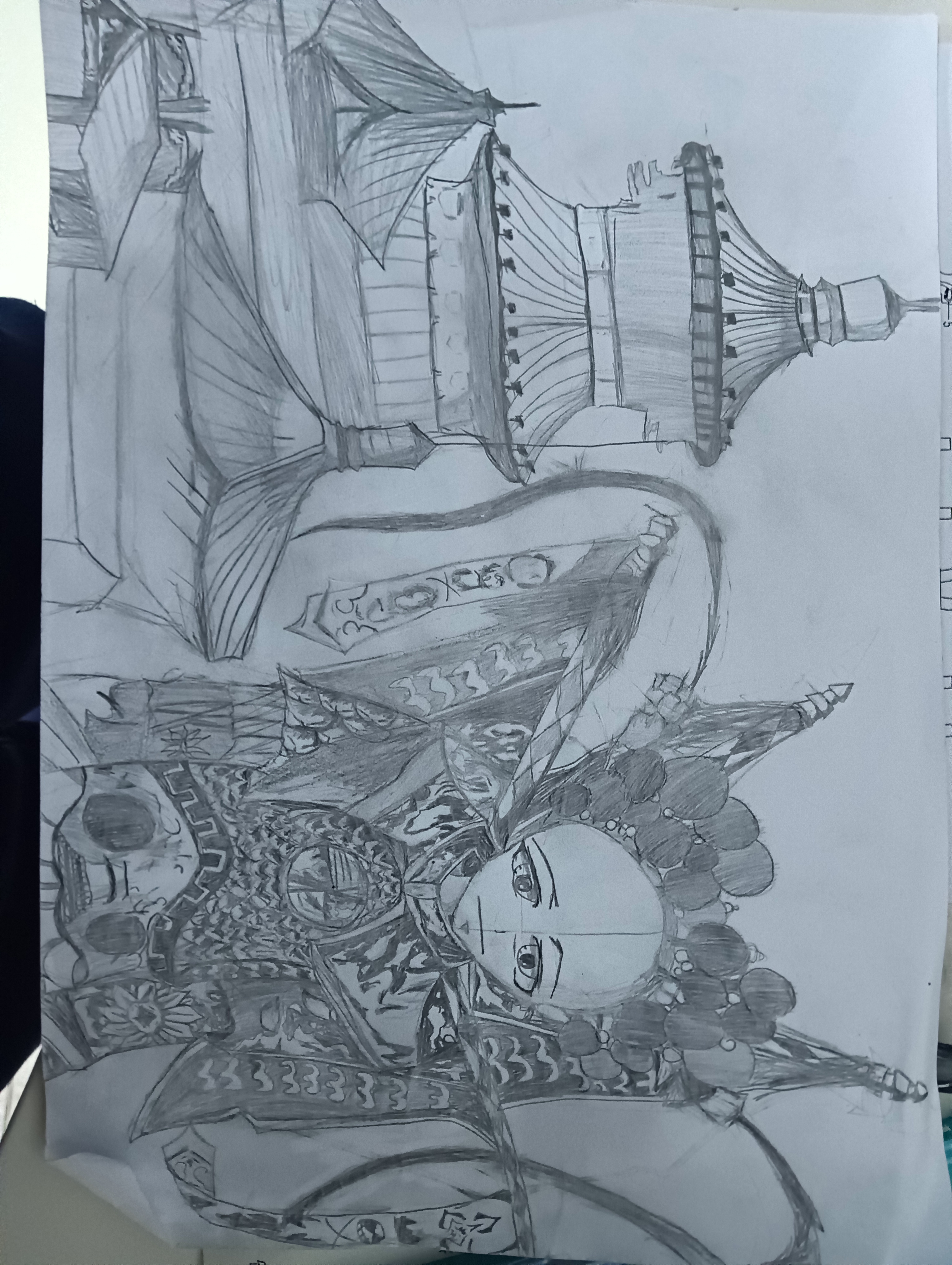 根据了陕西当地的京剧人物服装以及特色景点进行创建,并以我自己的所见绘画,由于人物脸部未找到合适发型与脸型,因此采用二次元的脸型,所以导致有些奇怪。绘画采用自动铅笔来画。人物服装图案以陕西京剧中的服装修改而成。