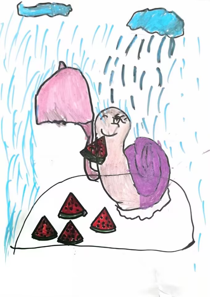 大家好!我画的是《保护环境才有西瓜吃的蜗牛乐园》。你看小蜗牛在雨天吃着甜甜的西瓜,多开心!这些西瓜都是因为我们保护好了环境才长出来的哦。要是环境不好,西瓜就长不出来了,蜗牛也没瓜吃啦。所以我们要好好保护环境,这样才能有甜甜的西瓜,还有可爱的小生物们快乐生活,大家说对不对!