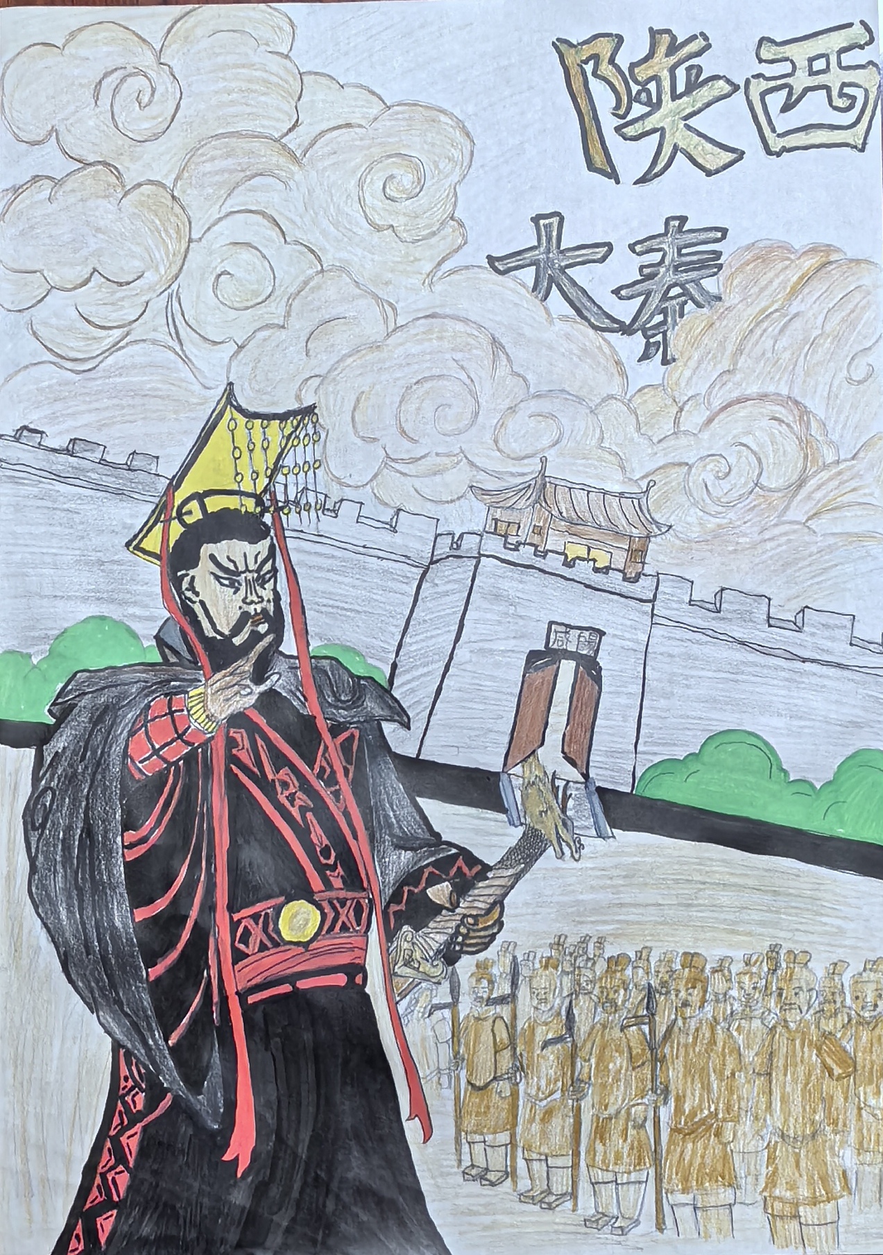 这幅作品以“大秦帝国”为核心,旨在展现秦王朝的雄浑气魄与历史底蕴。创作者选取秦始皇这一标志性人物,他头戴冕旒、身着华服,手持象征权力的器物,尽显帝王威仪。背景中的古城墙、城楼呼应陕西的历史地标,兵马俑军阵则凸显大秦军事与文化的震撼力。通过对服饰细节、建筑风貌的刻画,融合历史元素与艺术表达,传递出对大秦帝国统一伟业、制度创新的敬意,让观者在画面中回溯那段波澜壮阔的历史,感受陕西作为秦文化发源地的深厚底蕴。