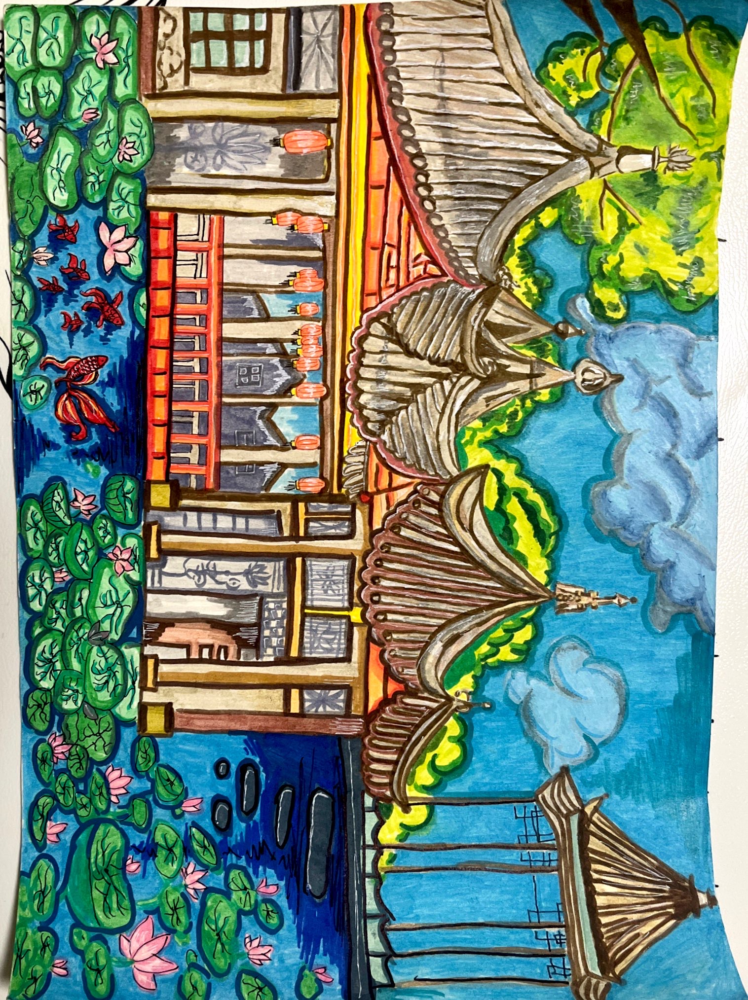 以江南古典园林的典型元素打破古典园林的素雅色调。在细节上,刻画建筑的木构纹理、荷叶的脉络、锦鲤的动态,用线条的粗细变化强化质感。引导视线流动,让画面在丰富中不失秩序,在传统中彰显创新。让观者能感到东方园林的文化底蕴,又能被现代艺术感给渲染。
