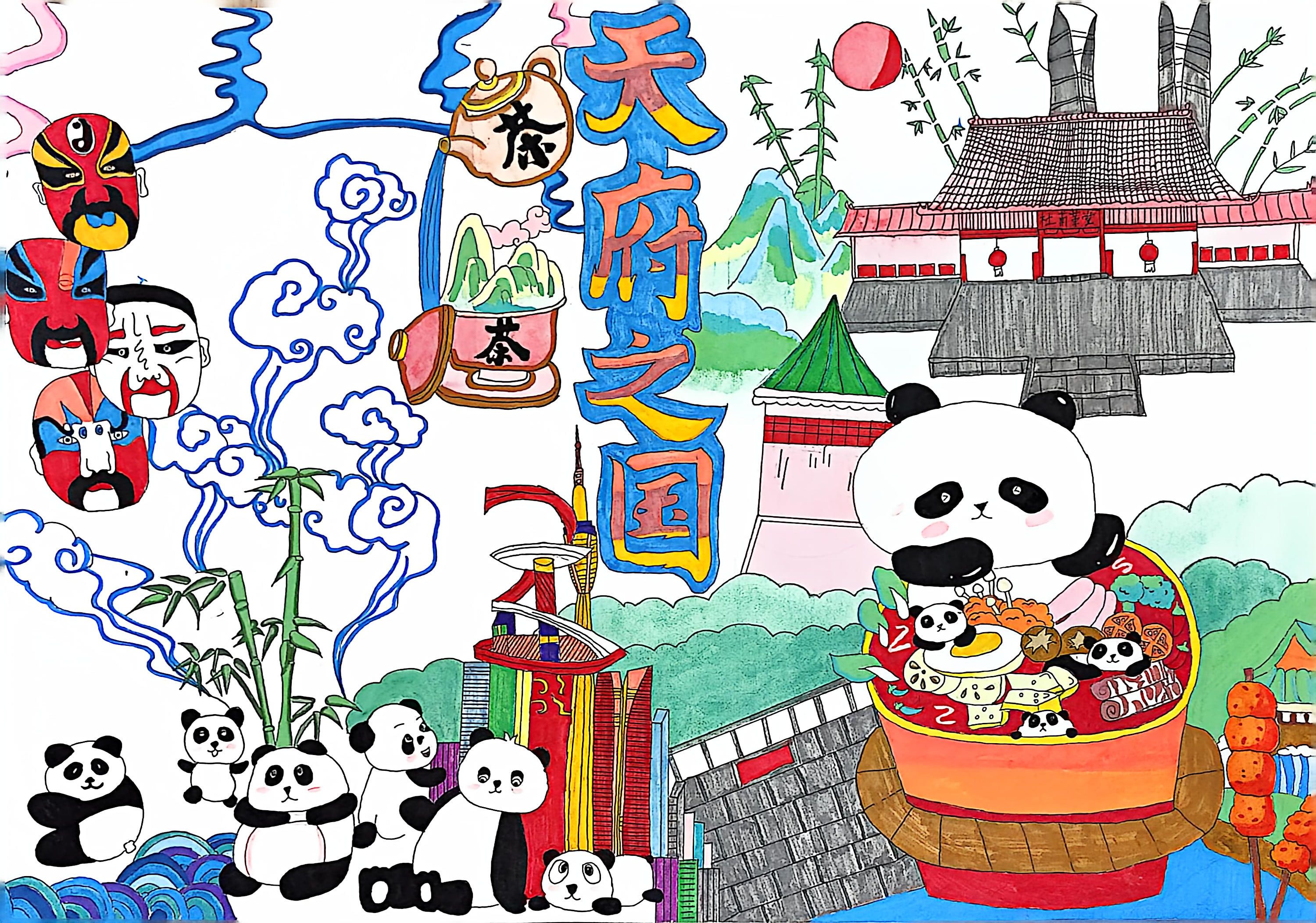 这幅画作将 “天府之国” 的灵秀与丰饶铺展成卷:画面里,川西平原沃野千里,金黄稻田翻着麦浪,岷江碧水蜿蜒其间,滋养着两岸青绿;远处峨眉山云雾缭绕,青城山黛色连绵,尽显山河之韵。 田间农人躬身劳作,竹屋旁大熊猫抱笋憨坐;市集一角,红油火锅腾着热气,锅盔、糖油果子透着烟火气。暖柔笔触勾勒出自然生机与人文烟火,既显天府的物产丰美,又藏川蜀的灵动风情,满是对这片土地的深情赞颂。