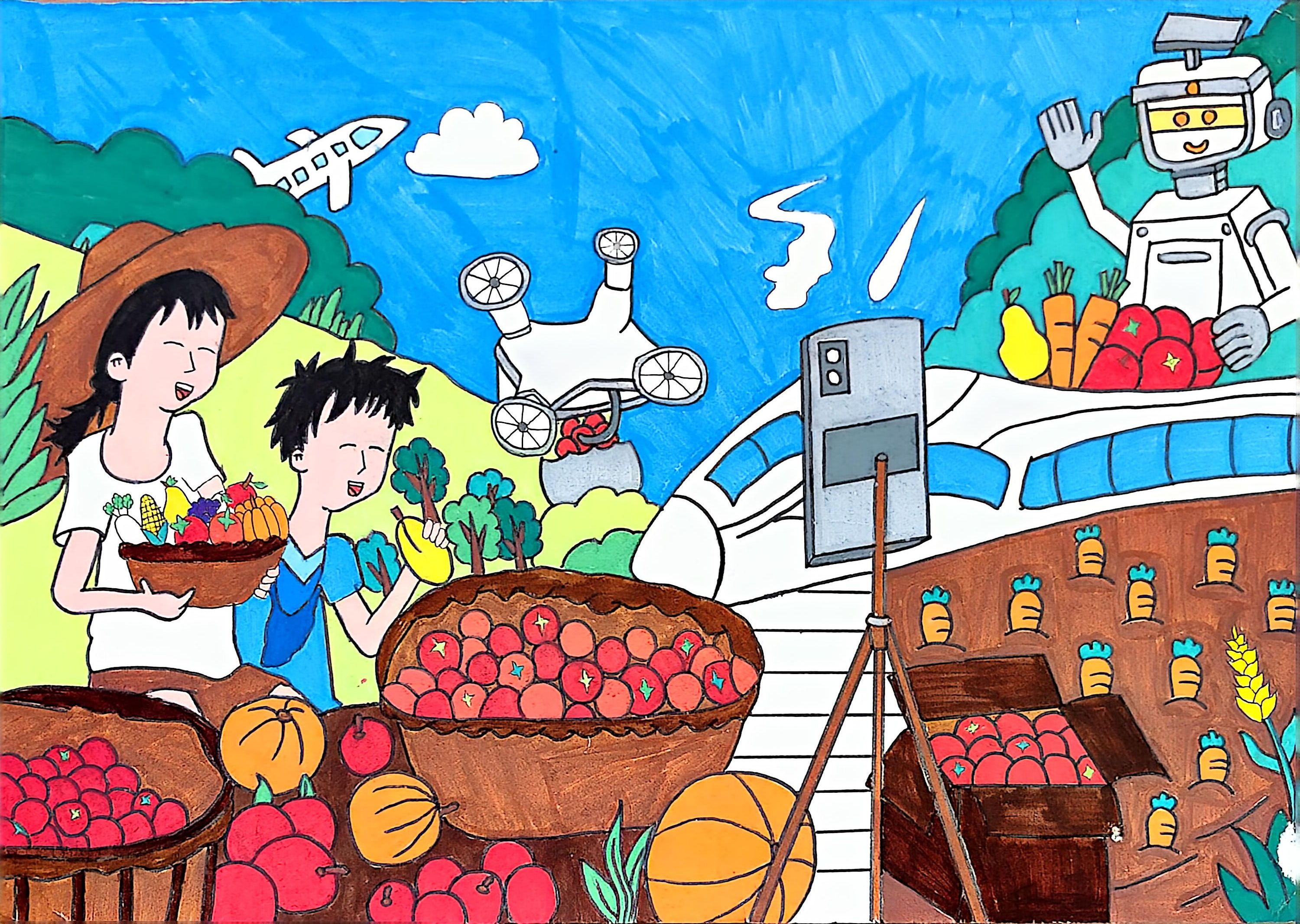 这幅画作定格科技赋能农业的喜人场景:田野里,金黄稻浪翻滚,饱满麦穗压弯枝头,尽显丰收盛景。田埂上,农户架着手机直播,屏幕映出直播间的热闹弹幕;无人机悬停半空,正喷洒农药,机械臂在旁高效收割。 农户脸上满是笑意,一手捧着刚摘下的果实,一手对着镜头热情介绍。暖黄笔触勾连起科技设备与丰收作物,既展现代农业的高效活力,又藏农户的喜悦,满是对科技助农的生动赞颂。