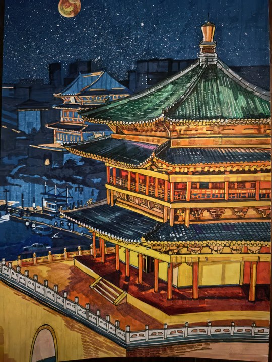 暮鼓晨钟七百年,东西相望守长安。朱红廊柱撑起巍峨楼阁,碧绿琉璃映照古城月色。钟楼如方印坐落城心,晨钟唤醒四方街市;鼓楼似画卷展开身姿,暮鼓送走八方过客。画中飞檐如翼,斗拱层叠,将长夜凝固成永恒。日升月落,它们静观车马川流,在古都中轴线上一声不响,却道尽了长安千年。