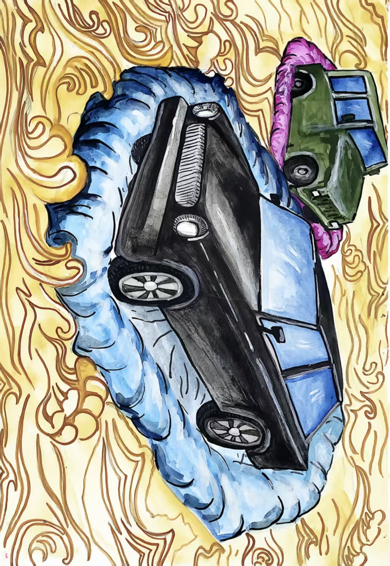 作品聚焦洪水、暴风雨等水患灾害痛点 —— 低洼地带车辆易被淹没,造成财产损失与安全隐患,构想一款兼具日常行驶与应急救生功能的智能汽车。 车辆底盘搭载高灵敏度水位感应系统,当接触到洪水时,会自动触发隐藏式救生垫弹出。救生垫快速充气展开,包裹车身底部,利用浮力让汽车像佩戴救生圈的人一样平稳漂浮,避免被洪水浸泡损毁。 画面中,救生汽车漂浮在洪水面上,车内人员安然无恙,周边是被洪水环绕的场景。既展现科技对灾害的应对力,更传递 "科技守护出行安全" 的愿景,减少水患带来的损失,为人们的出行增添一份安心保障。