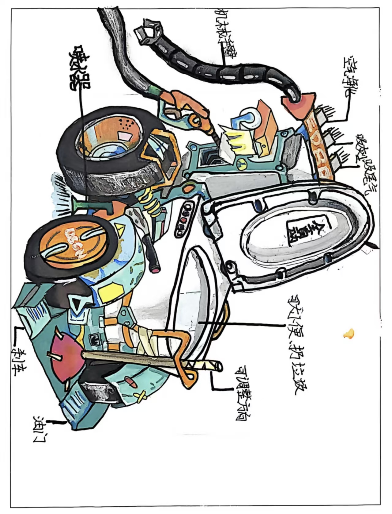 作品聚焦公共场所卫生痛点 —— 部分家长带小孩随地大小便,既破坏公共环境,也增加环卫工作负担,构想一款兼具如厕便利与垃圾处理功能的智能设备。 该设备形似便携马桶,兼顾垃圾箱核心功能:专为小孩设计舒适如厕区,解决临时需求;同时搭载智能感应与清扫系统,能自动识别并清扫设定区域内的垃圾,还可对投入的垃圾进行分类收纳。既方便家长带娃使用,又在默默清理周边垃圾。既展现科技对生活细节的优化,更传递 "守护公共卫生,减轻环卫负担" 的愿景,让公共场所更洁净有序。
