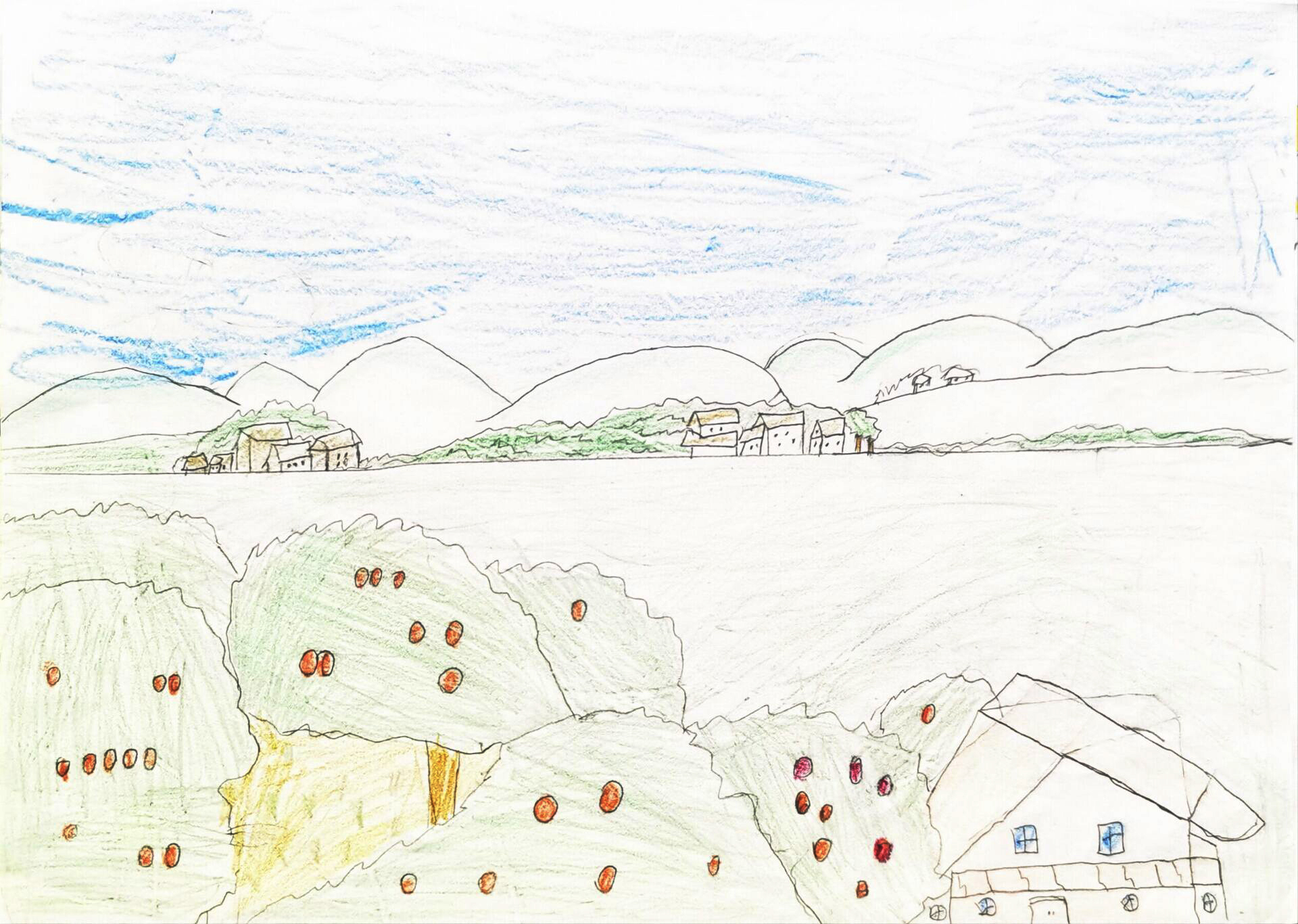 大家好!我画的是《田园乡野环保小村落》。你看,绿油油的果树、错落的房屋,远处还有连绵的山丘。乡村的环境特别美,我们要保护这些树木和土地,不乱扔垃圾、不破坏植被。只有保护好乡村环境,小鸟才有栖息的地方,我们也能一直看到这么清新的景色。欢迎大家和我一起守护乡村,保证你们会爱上这片需要我们呵护的田园小天地哦!