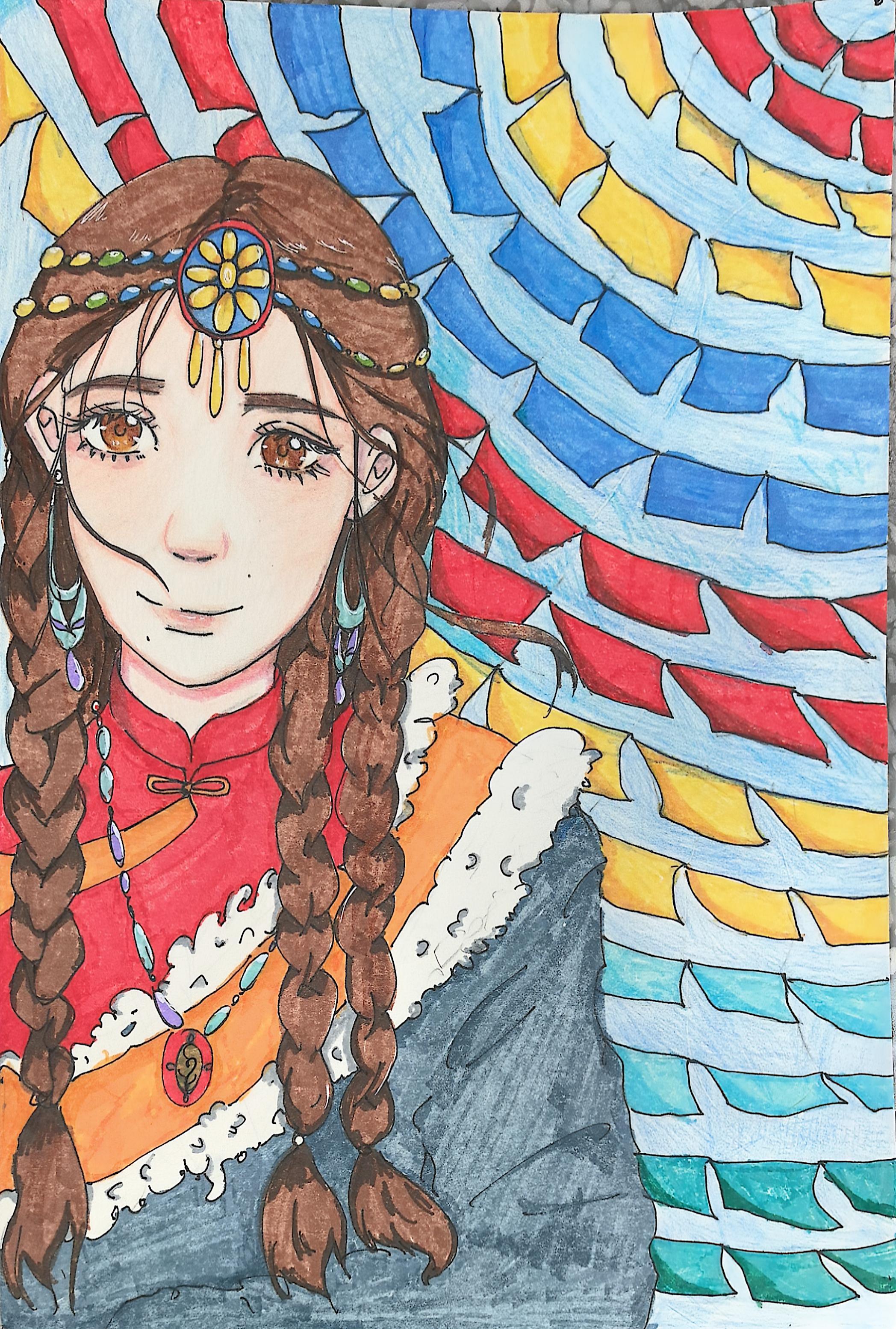 这是一幅有关于藏族特色文化的作品,使用了马克笔铺色,彩铅修饰细节的手法,少数民族文化是我们中华特色传统文化不可分割的一部分,图中的主人公是一位藏族女孩,她的装束是藏族服装的其中一种,背景是藏族地区常有的建筑,大多数在寺庙外。它在藏族的文化中寓意美好,代表了藏族同胞们对吉祥如意,生活美好的追求,这也是我们中华民族在平凡生活中的追求。