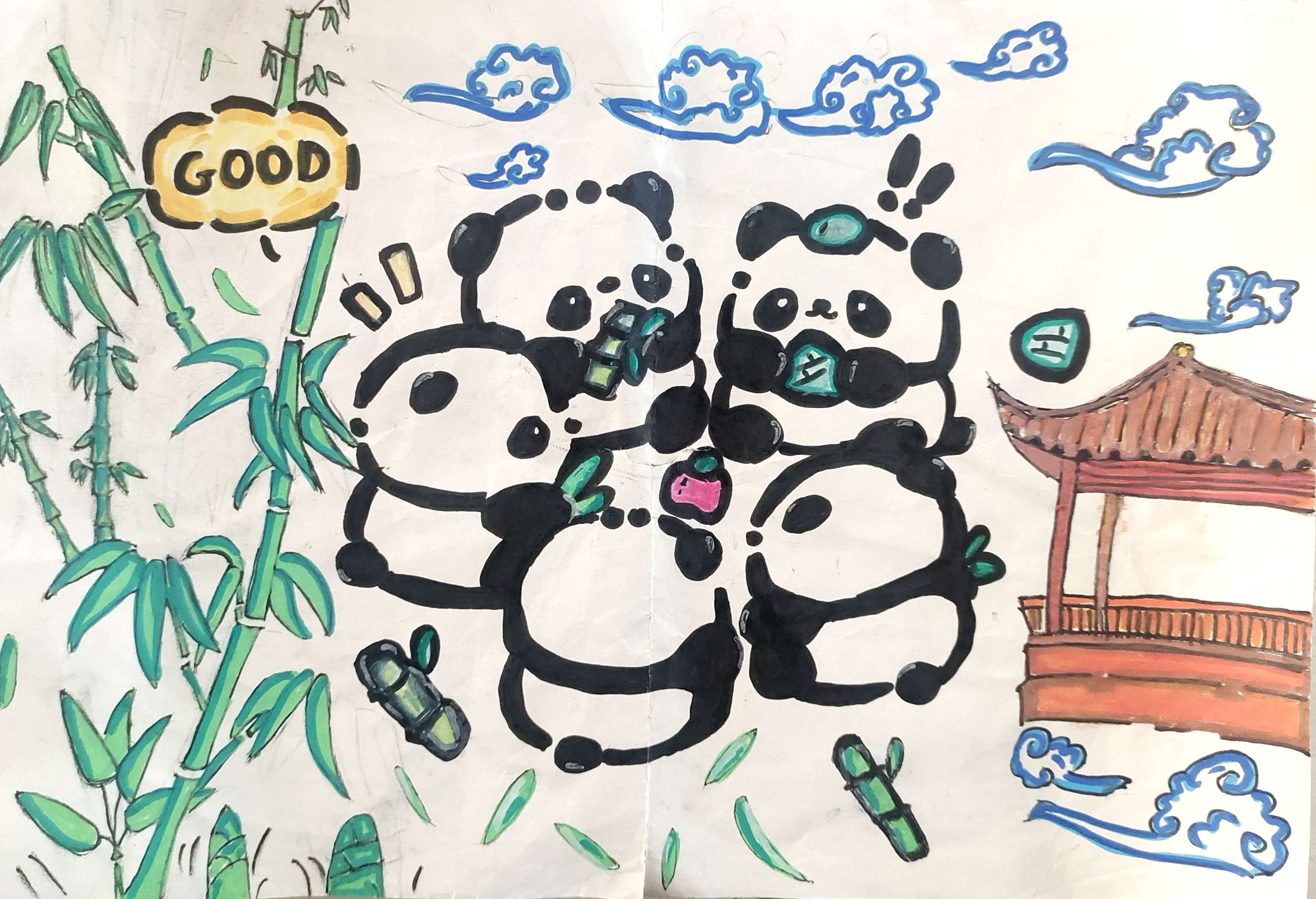 这幅画展现了一群憨态可掬的熊猫在古韵场景中的欢乐聚会。翠绿竹林、传统建筑与灵动云朵烘托氛围,熊猫们或抱竹、或捧物,神态各异, “GOOD” 字样添活泼感,将国宝的可爱与中式美学融合,传递出轻松愉悦、充满童趣的氛围,尽显对熊猫与传统文化的喜爱 。
