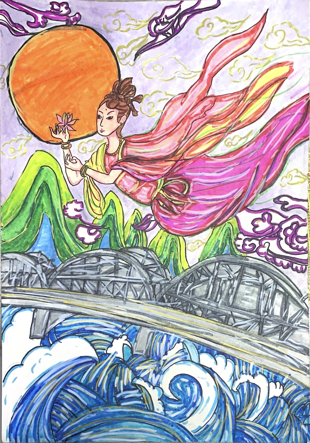 作品以兰州中山桥为现实锚点,将其钢铁架构的工业质感与黄河的壮阔波澜作为画面基底,展现兰州“黄河第一桥”的地理与历史分量。同时,打破时空界限,让敦煌飞天从壁画中“走出”,或衣袂飘飘掠过桥身,以轻盈飘逸的姿态与中山桥的厚重形成视觉对比。既体现甘肃“丝路文化”与“黄河文化”的交融,也借飞天的灵动寓意甘肃在历史传承中焕发的新生机,让古老文明与现代地标共生共辉。