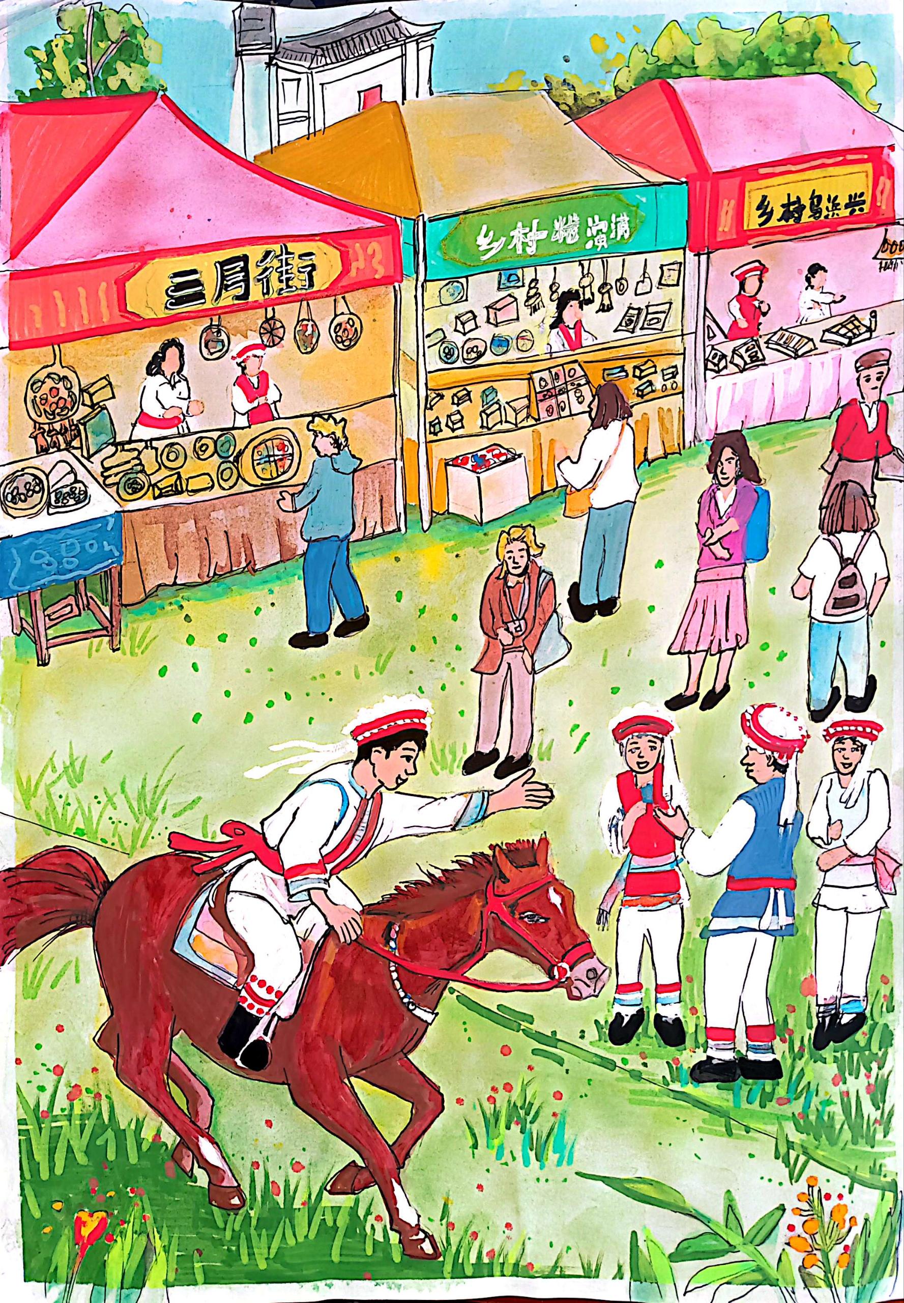 画面以大理“山月街”为核心的场景,即展现了白族传统集市的热闹烟火气,又通过“乡村振兴”主题摊位,串联起民族文化传承与乡村发展的时代脉络,骑马的白族青年更是将民族活力与迎宾热情具象化,让传统盛会在新时代的图景里焕发.