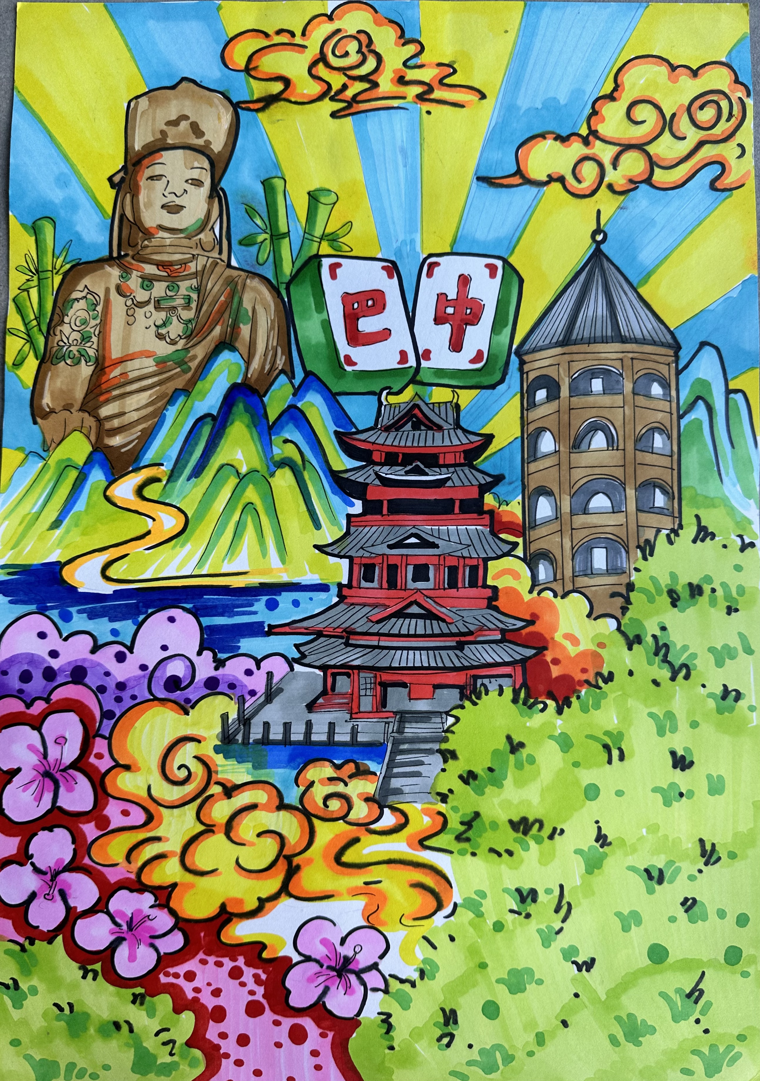 这幅画把巴中底色揉进绚烂里:南龛石窟的佛像藏着盛唐笔触,回风亭的塔影浸着米仓古道的风,朱红楼阁映着巴河清波。"巴中"二字化入麻将元素,裹着巴人文化的烟火气——既有石窟造像的厚重,又有山水小城的鲜活,把千年文脉与市井温情,都织进这抹明丽的色彩里。