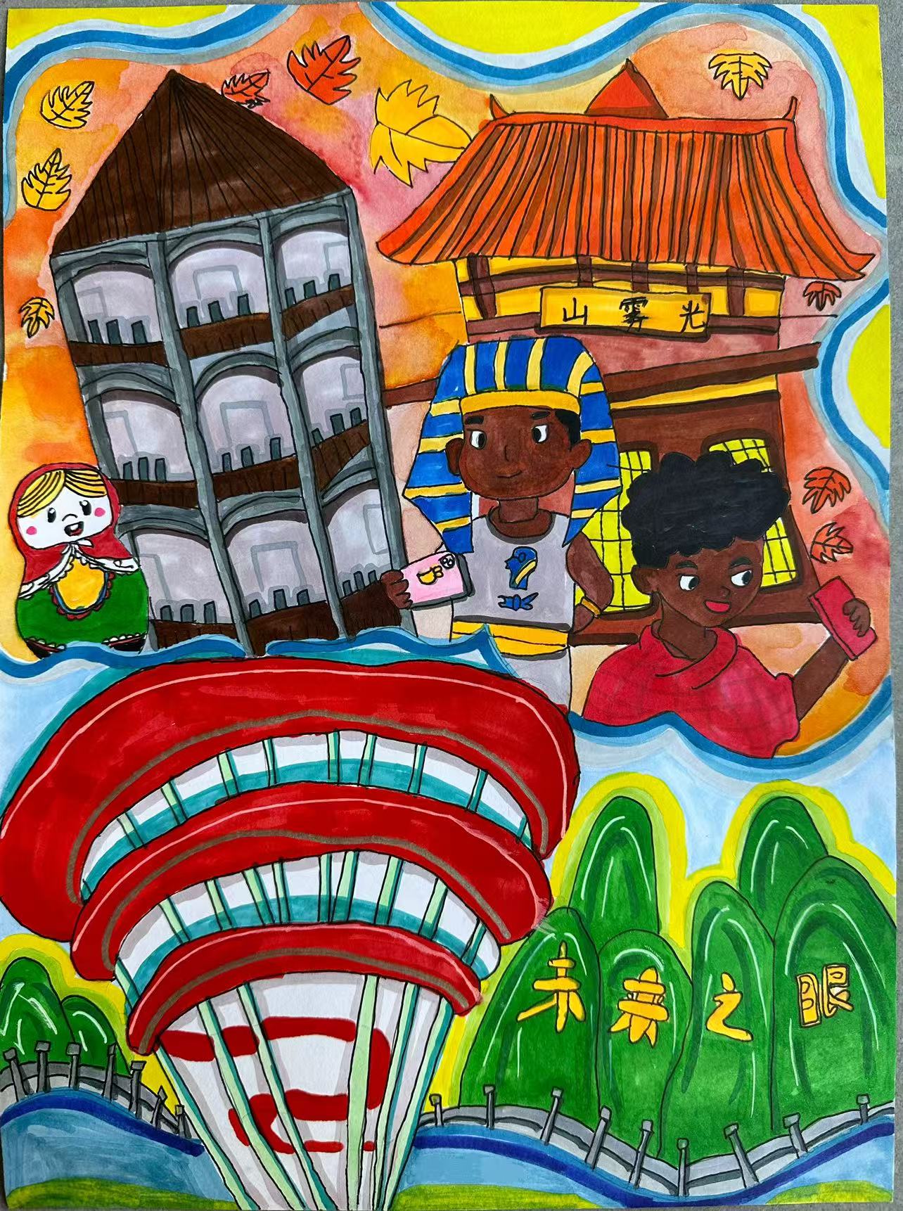 这幅画把巴中揉进古今碰撞里:光雾山的层林(画中"光雾山"题字)裹着红叶诗意,恩阳古镇的飞檐藏着米仓古道的风,而螺旋状的"未来之眼"(恩阳地标)正以凤凰之姿眺望新城。不同面孔的旅人举着手机,把巴中的自然盛景、千年文脉与现代烟火,都收进这帧流动的画卷里。