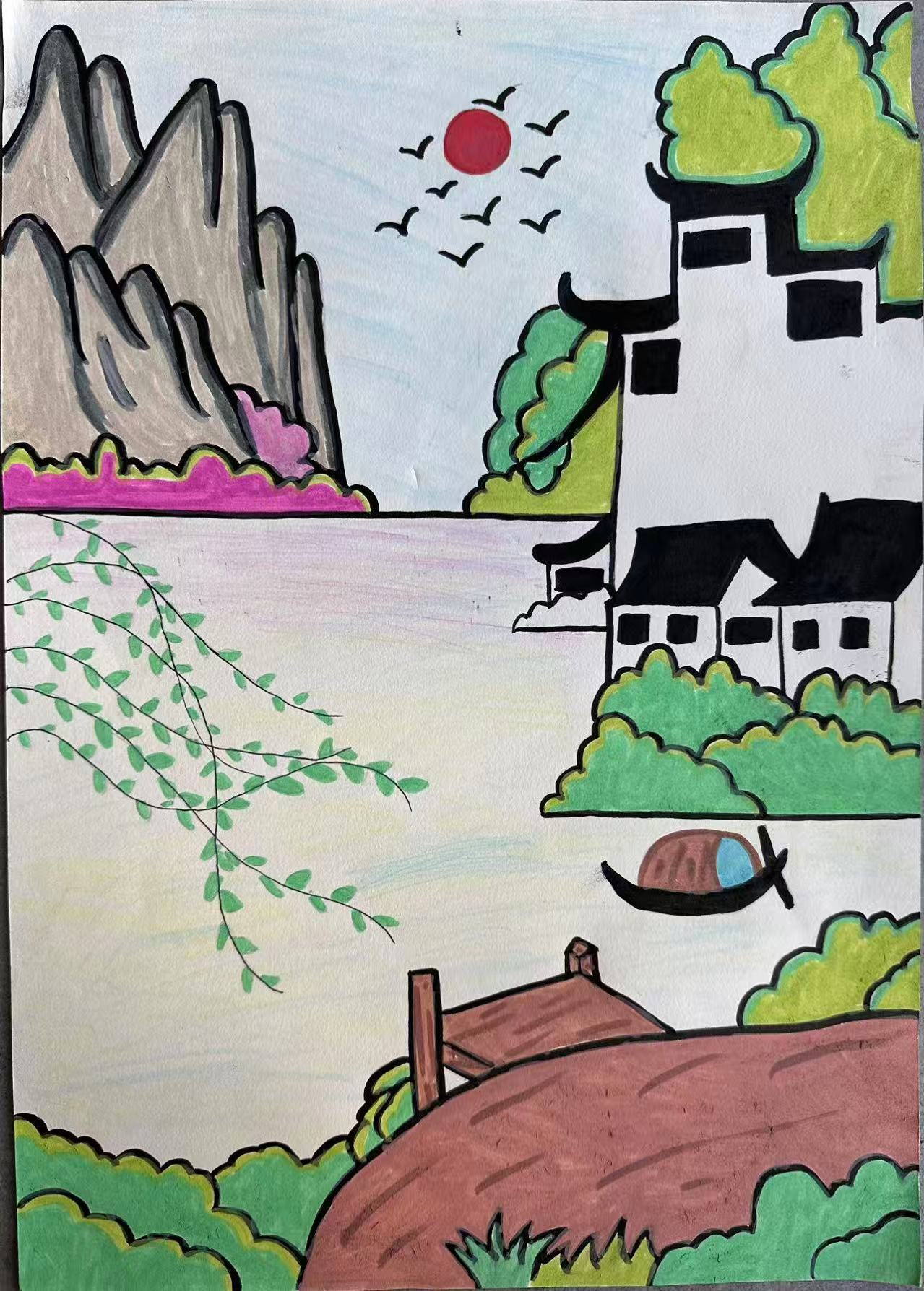 这幅画是江南的温柔剪影:黛瓦白墙偎着碧水,扁舟轻荡过柳丝垂岸,远山裹着晨雾晕染出淡墨色。朝阳与归雁织就晨时清欢,粉紫花岸衬着水乡的软——这里藏着江南的魂:不是浓妆艳抹,是"水绕人家,山衔晓日"的松弛,是桨声里漫开的烟火与诗意。