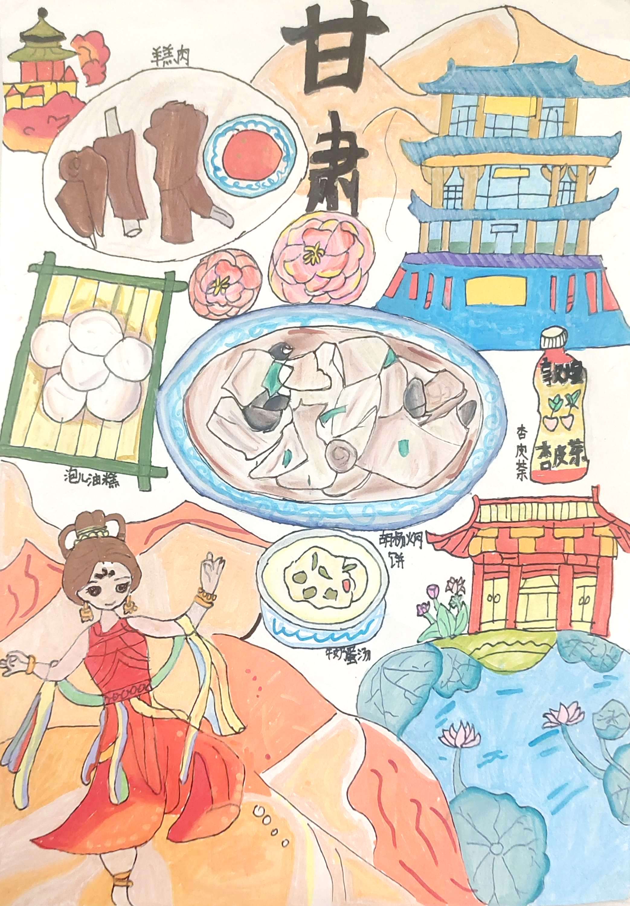 我画的是甘肃老家的特色美食。这幅作品聚焦甘肃,以丰富元素展现其独特魅力。有敦煌飞天灵动舞姿,彰显文化底蕴;羊肉、泡儿油糕等美食,传递舌尖美味;传统建筑与山水相融,搭配杏皮茶,勾勒出甘肃风土人情,是对陇原大地的生动绘写 。