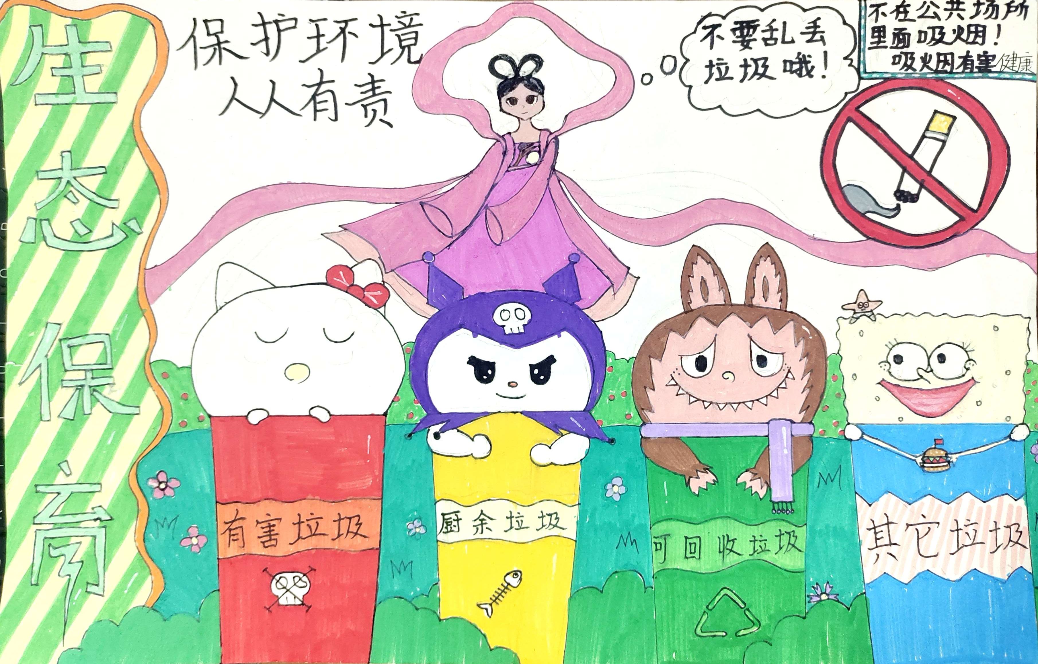《环保小卫士的垃圾分类派对》 这幅画以 "生态保育" 为主题,创意呈现垃圾分类。可爱卡通形象 "住进" 不同垃圾桶,对应有害、厨余、可回收与其他垃圾。画面上方 "保护环境 人人有责" 等标语,搭配禁烟标识,用童趣方式呼吁大家践行垃圾分类、守护环境,让环保理念在趣味中传递 。