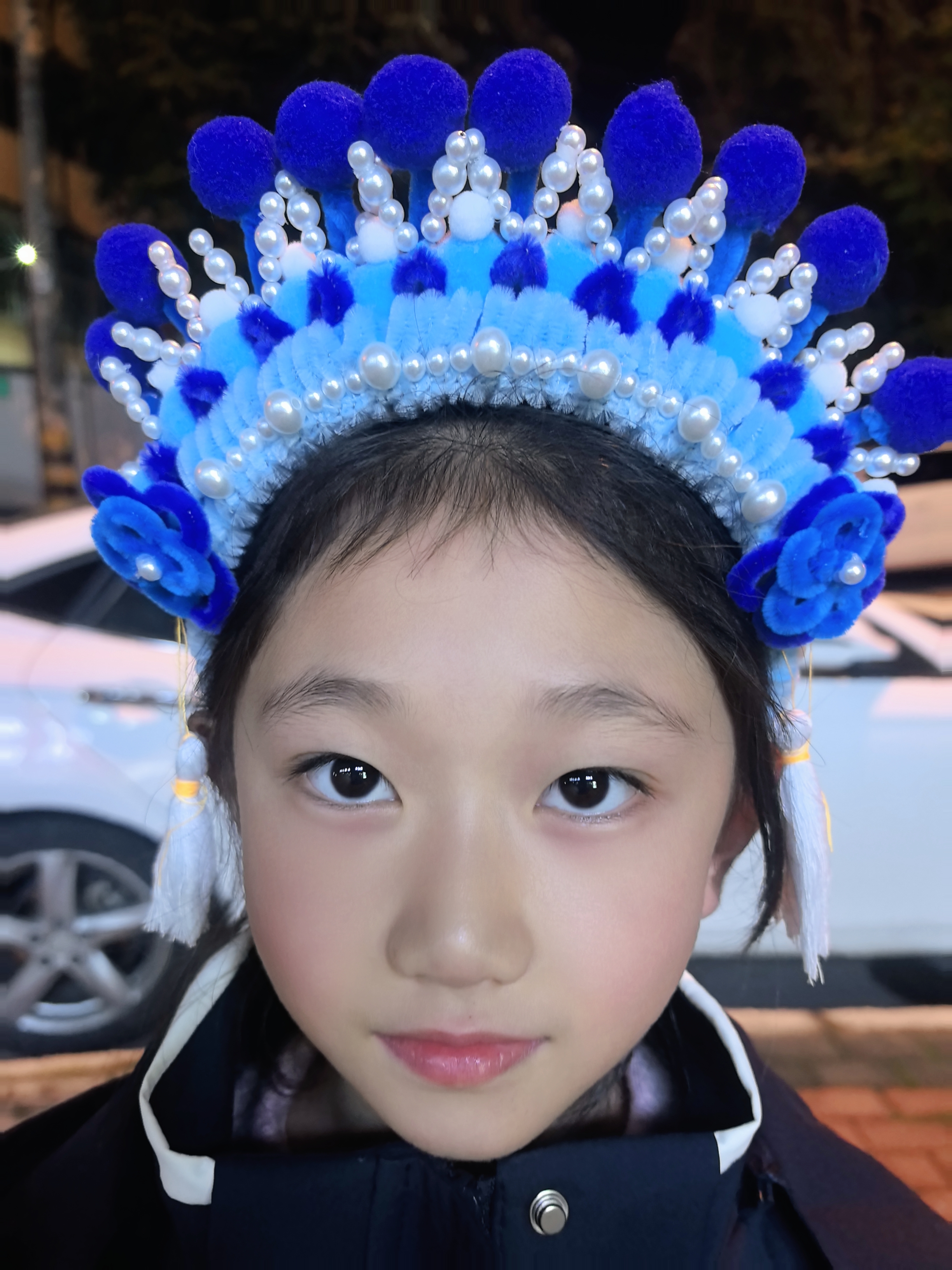 文化根脉:提取京剧旦角头面的经典元素(绒球、珍珠、层叠绒花),用高饱和度的蓝白配色还原戏曲行头的华丽质感,让传统戏曲符号成为视觉核心。童趣适配:弱化专业头面的厚重感,以轻盈的绒材、圆润的造型适配孩童佩戴,既保留戏曲头饰的仪式感,又符合儿童的可爱气质。古今融合:将传统戏曲装饰语言与现代审美结合,用明亮色彩和简化工艺,让非遗美学以更轻松的方式融入日常,唤起对传统艺术的亲近感。