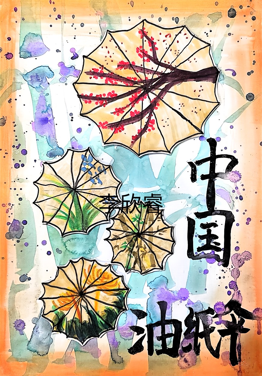 这幅画以传统油纸伞为核心,将梅枝、草木等意象藏进伞面纹理里,搭配水墨质感的“中国油纸伞”字样,用晕染的色彩和灵动的墨点,把中式美学的雅致与烟火气揉在一起——每一把伞都是一个小世界,裹着东方韵味的温柔,也藏着对传统手工艺的轻软偏爱。