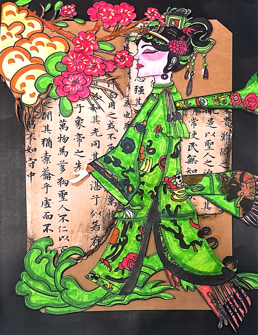 这幅画融合陕西皮影戏与古文化底色——身着花饰绿袍的仕女,是陕西皮影标志性的灵动造型,背景的古卷文字(呼应陕西作为文化古都的典籍氛围)、红梅纹样,裹着陕地民间艺术的浓艳与古意。陕西皮影是当地非遗瑰宝,常以戏曲人物承载文化记忆,这幅画用剪纸式的鲜活笔触,把皮影的民间烟火与长安古卷的文韵揉在一起,是陕西文化肌理里的雅俗共生。